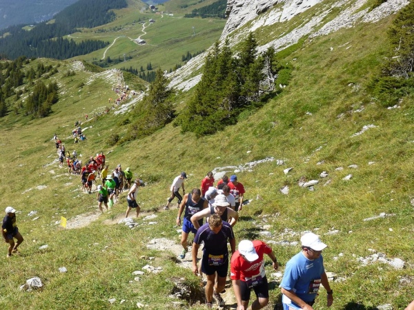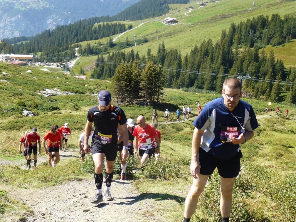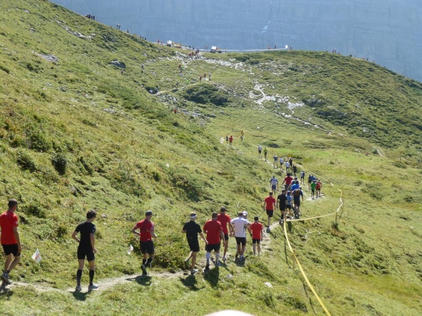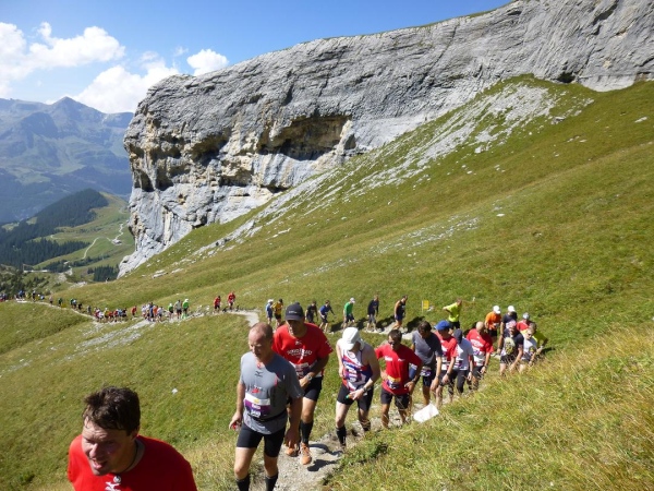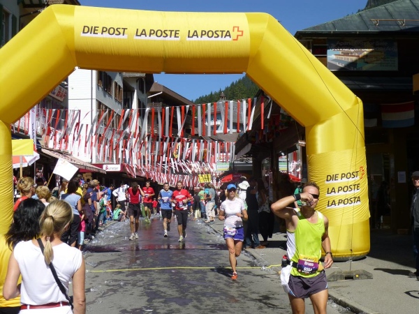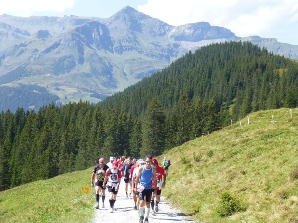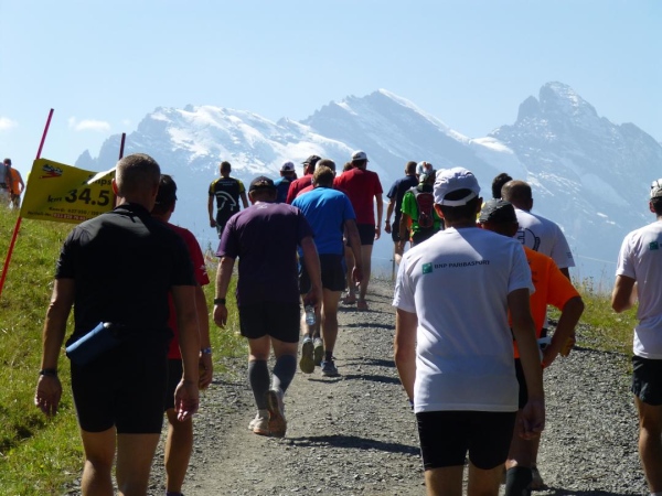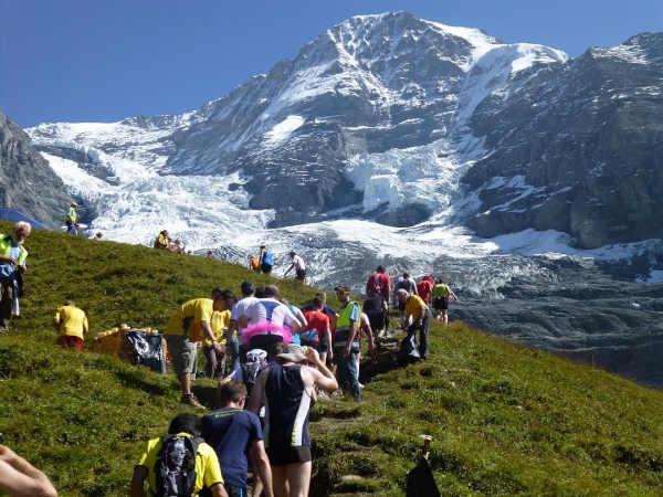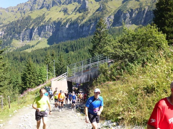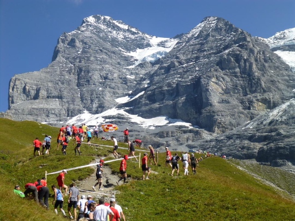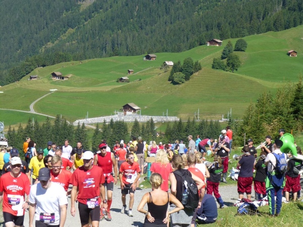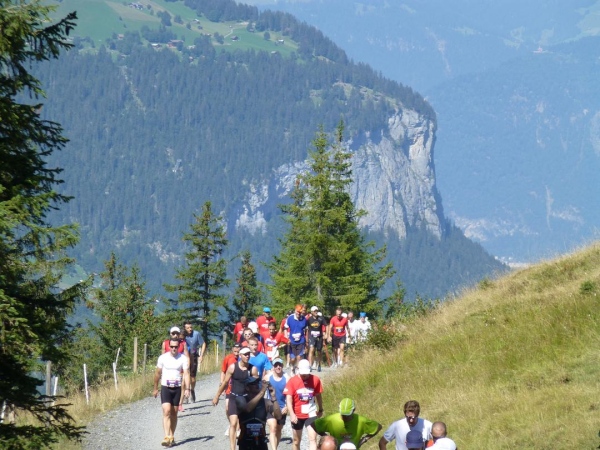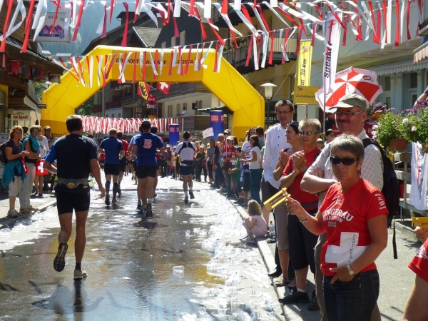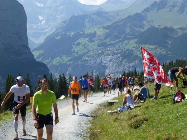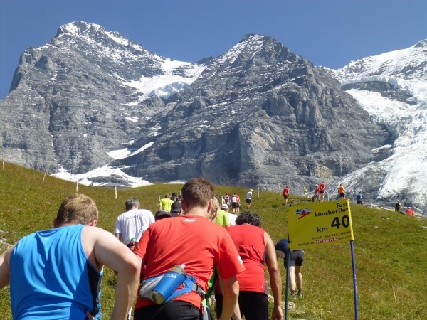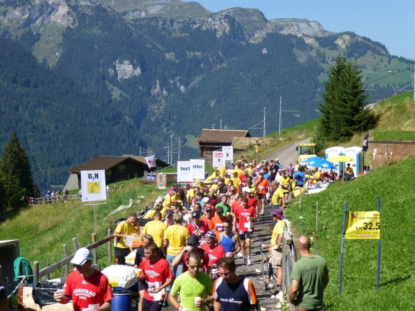 Absolut hervorragend und durchdacht ist die Verpflegungssituation. Bereits 2 km nach dem Beginn der Steilpassage in Lauterbrunnen bekommen wir wieder Wasser, nach weiteren 1,5 km ist erneut „full service“ angesagt. Die stolze Zahl von 15 Verpflegungsstationen ist zwischen Start und Ziel eingerichtet, davon fünf auf der leichteren ersten Streckenhälfte, zehn auf der anstrengenderen zweiten. Nur drei davon sind reine Wasserausgabestellen, positioniert dort, wo Flüssigkeit aufgrund der vorangegangenen Anstrengung besonders benötigt wird. Ansonsten variiert das Angebot. Es reicht von isotonischen Getränken über Cola bis zur Bouillon, daneben gibt es Energy-Gels und -Riegel, Magnesiumtabs und Bananen.