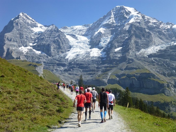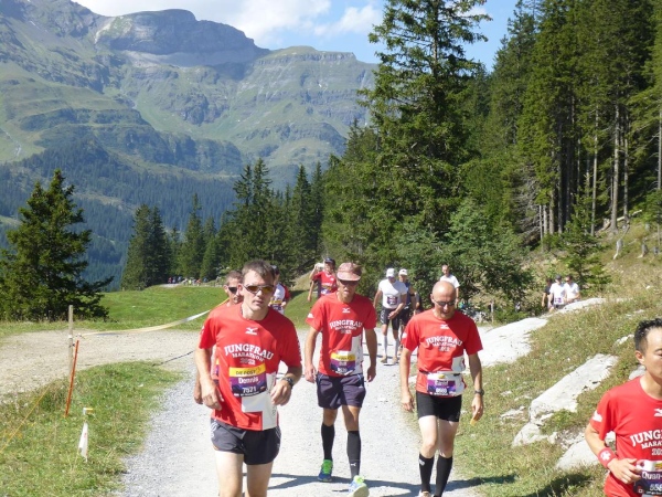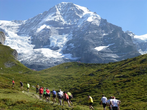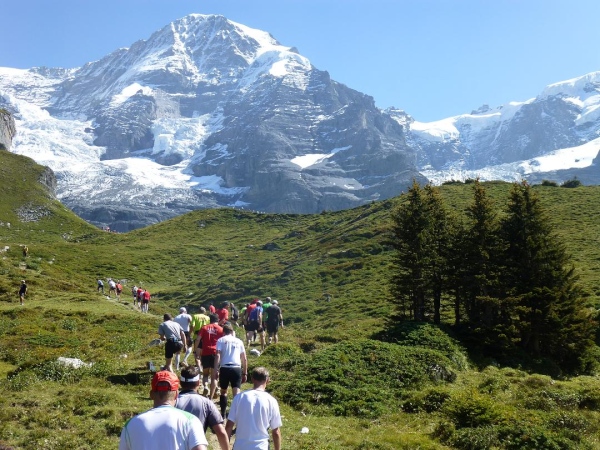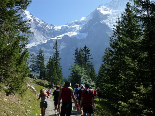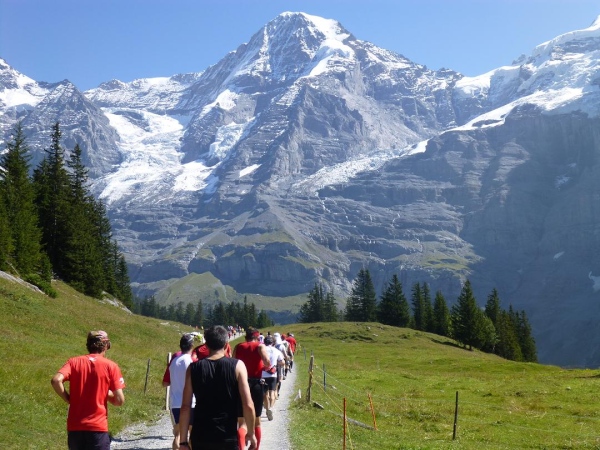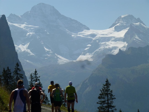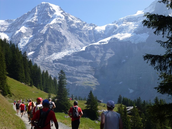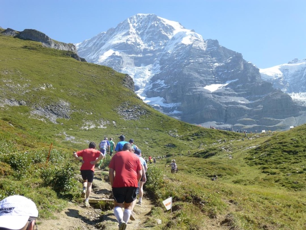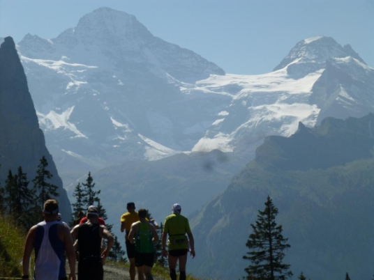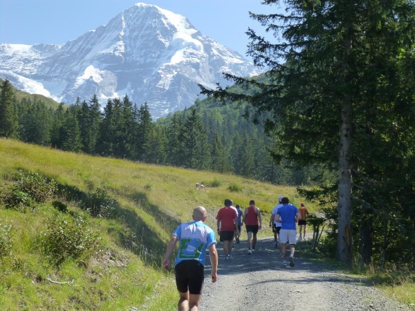 Bei km 35,5, auf Höhe der Mettlenalp, ist es soweit. Unser Weg folgt der Biegung des Berghangs und auf einmal ist sie da – zunächst noch teilweise durch Fichten verdeckt, dann immer offener und schließlich in voller Pracht: Die Bergkette aus Eiger (3.970 m) , Mönch (4.107 m) und Jungfrau (4.158 m), das berühmte Dreigestirn, schnee- und gletscherbedeckt, mächtig, unnahbar. Das ewige Eis leuchtet im gleißenden Sonnenlicht. Eine Traumkulisse. Nicht nur ich bin einfach hin und weg. „Einfach Wahnsinn“ – „irre“ – „immer wieder überwältigend“, höre ich andere Läufer sagen. Und so ist es. Im krassen Gegensatz zu den schroffen, uns weit über 2000 m überragenden Felsriesen stehen die sanften, grünen Hügel, über die uns bewegen, geradewegs hin zu dieser Szenerie.