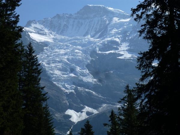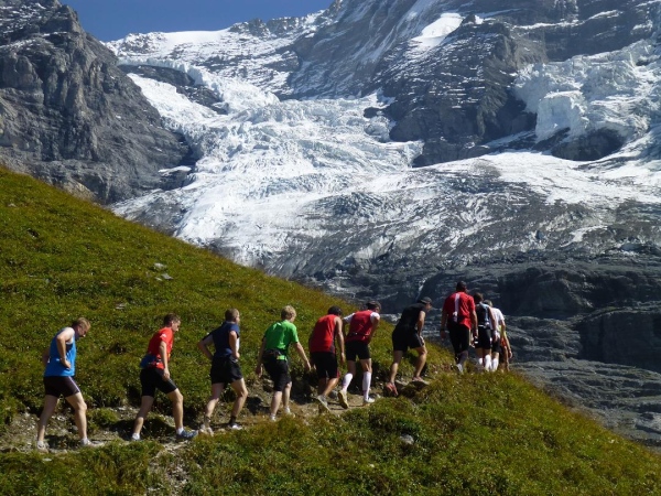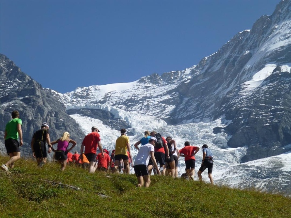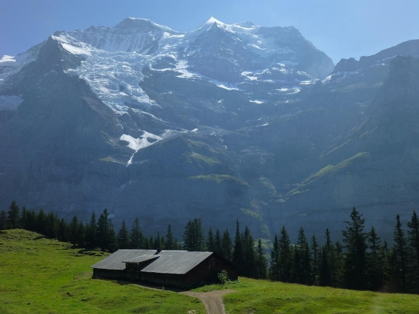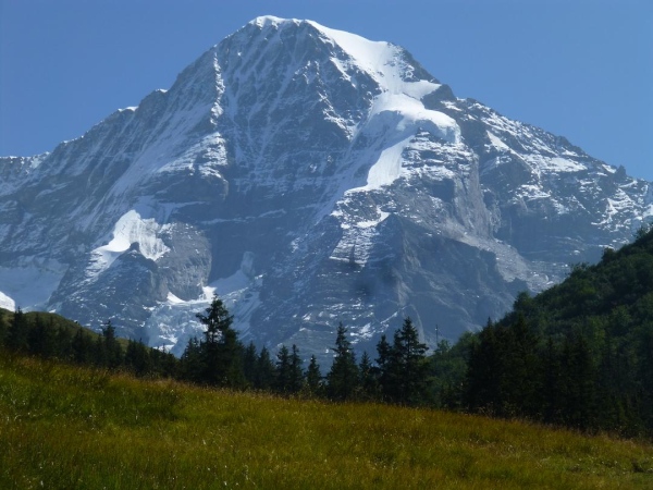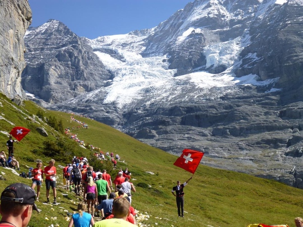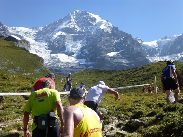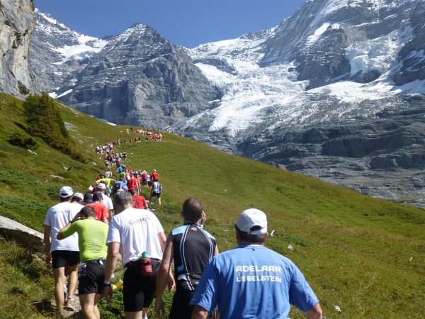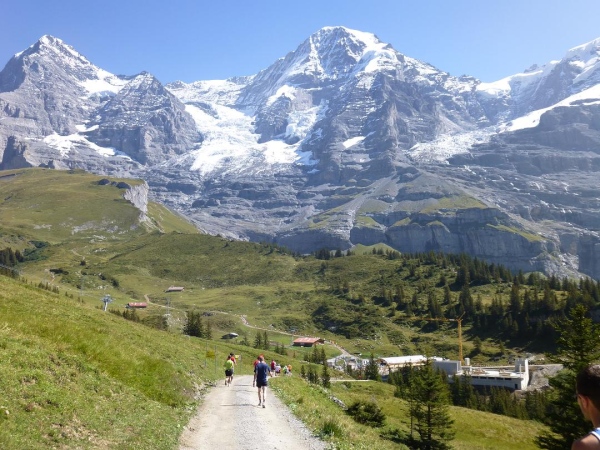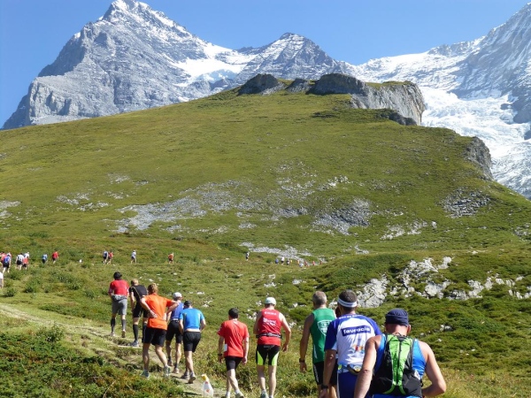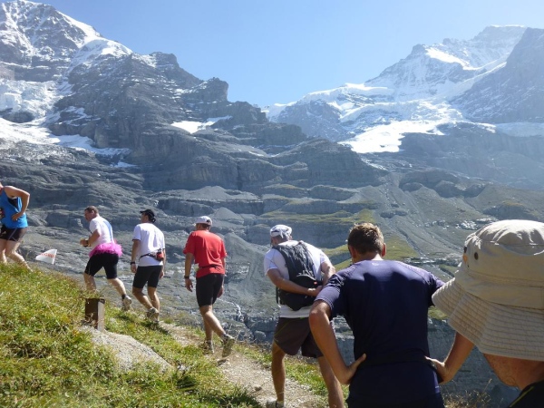 Bei km 35,5, auf Höhe der Mettlenalp, ist es soweit. Unser Weg folgt der Biegung des Berghangs und auf einmal ist sie da – zunächst noch teilweise durch Fichten verdeckt, dann immer offener und schließlich in voller Pracht: Die Bergkette aus Eiger (3.970 m) , Mönch (4.107 m) und Jungfrau (4.158 m), das berühmte Dreigestirn, schnee- und gletscherbedeckt, mächtig, unnahbar. Das ewige Eis leuchtet im gleißenden Sonnenlicht. Eine Traumkulisse. Nicht nur ich bin einfach hin und weg. „Einfach Wahnsinn“ – „irre“ – „immer wieder überwältigend“, höre ich andere Läufer sagen. Und so ist es. Im krassen Gegensatz zu den schroffen, uns weit über 2000 m überragenden Felsriesen stehen die sanften, grünen Hügel, über die uns bewegen, geradewegs hin zu dieser Szenerie.