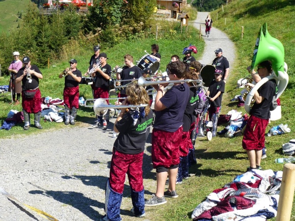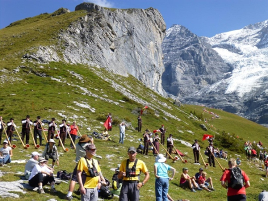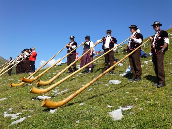 Ein kurzes Wegstück führt schließlich sogar nochmals bergab, ehe uns kurz vor km 40 traditionell ein Dutzend malerisch im Wiesenabhang aufgereihter Alphornbläser musikalisch auf den letzten großen Anstieg vorbereitet. Weithin hörbar schallen die getragenen Klänge der Schweizer Nationalinstrumente durch die Bergwelt. Dazu lassen Fahnenschwinger großflächige Schweizer Fahnen durch die Luft wirbeln - vor der Kulisse des übermächtigen Gebirgsstocks ein überaus reizvolles, irgendwie unwirkliches Bild. Ich frage mich, wie es die Organisatoren wohl geschafft haben, die musikalischen Ungetüme an diesen Ort zu bringen.