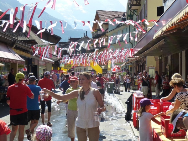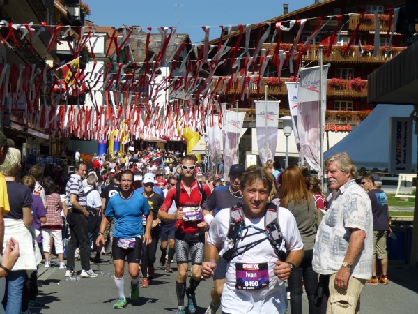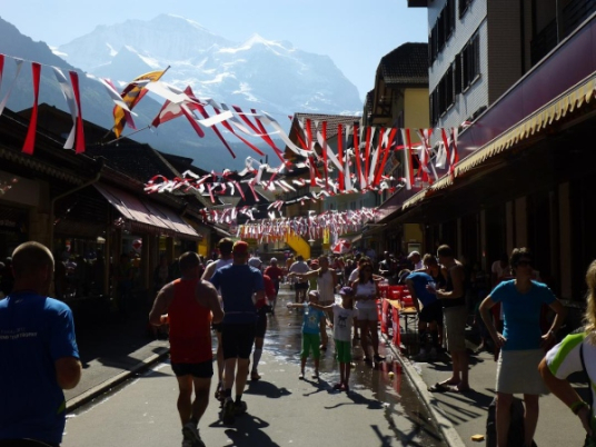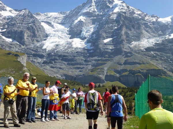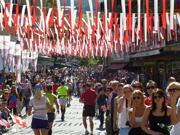 Etwa bei km 30 erreichen wir das 1280 m üNN gelegene Dorf Wengen, international vor allem bekannt durch das Lauberhornrennen im Rahmen des Skiweltcups. Unser Laufparcours führt geradewegs die Hauptstraße des langgezogen im steilen Hang klebenden Ortes entlang. Und wie schon in Lauterbrunnen empfängt uns auch hier ein Menschenauflauf und eine Emotion, die man sie bei einem Berglauf, selbst wenn es die Weltmeisterschaft ist, nicht erwarten würde. Ein ohrenbetäubendes Getröte und Getrommel, Gejohle und Geratter begleitet uns auf unserem Weg, Bänder aus roten und weißen, im Wind flatternden Streifen überspannen wie ein luftiger Baldachin die Straße und unterstreichen auch optisch die Partylaune. Ich lasse mich von der Stimmung durch den Ort tragen, vergesse die Schwere in meinen Beinen, habe teil an diesem Fest, das Läufer und Zuschauer hier gemeinsam feiern.