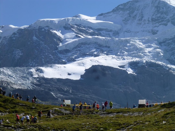 Wie wichtig die ausreichende „Bewässerung“ ist, zeigt sich gerade an einem Tag wie heute, an dem sich der Sommer noch einmal mit voller Kraft zurück meldet. Im offenen Gelände brennt die Sonne gnadenlos auf uns nieder, der Schweiß fließt in Strömen, so mancher kämpft mit Krämpfen. Aber zum Glück: Die nächste Erfrischung ist nie weit. Die andere Seite dieser Laufbedingungen ist jedoch: Ein traumhaftes Bergpanorama. Je höher wir kommen, desto weiter reicht der Blick über die umgebenden Berge und desto tiefer in das Tal hinein. Und am südlichen Horizont, noch weitgehend verdeckt, spitzt ab und an verheißungsvoll gleißend das Jungfraumassiv hervor.