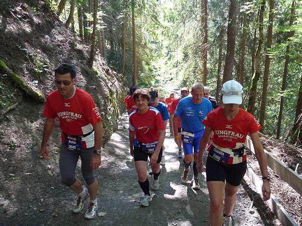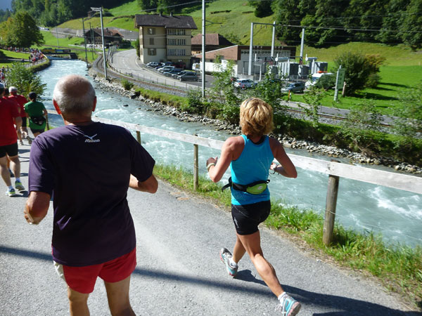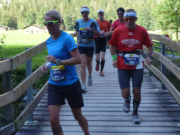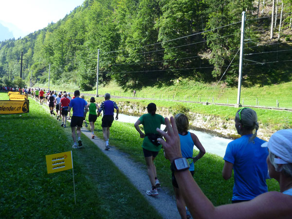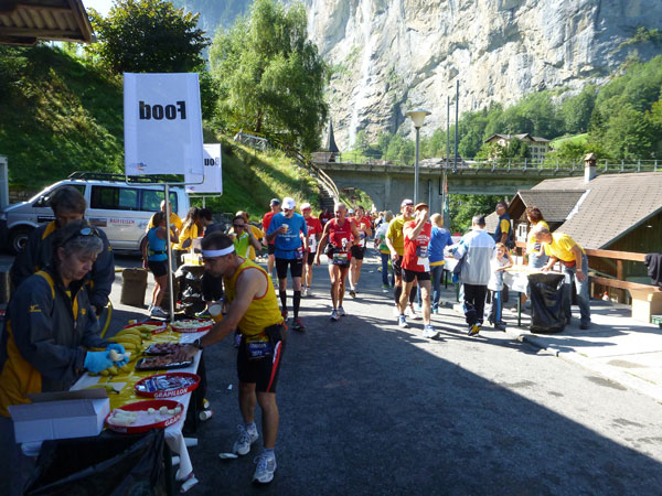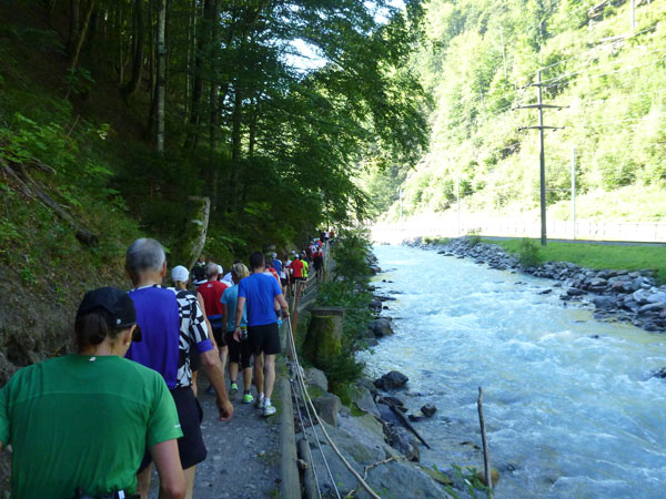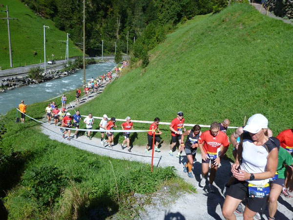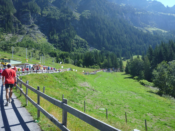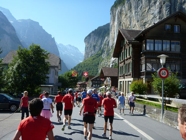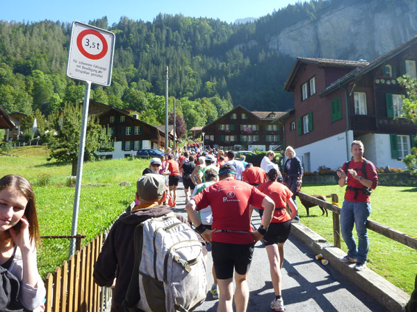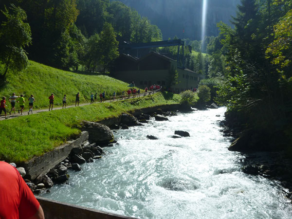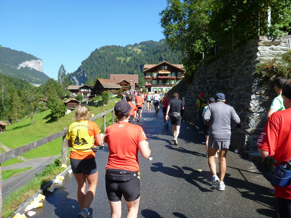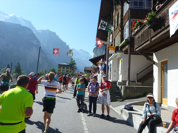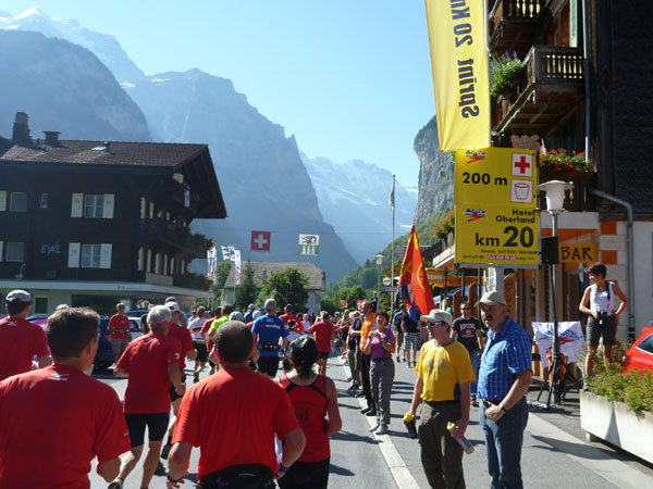 Die steigende Strecke und die Naturwege sorgen dafür, dass sich mein Tempo automatisch etwas verringert. In Lauterbrunnen (km 20) habe ich noch 4 Minuten plus auf meine Sollzeit. Na also, so langsam passt mein Tempo. Beim Ortsdurchlauf durch Lauterbrunnen steppt wie immer der Bär, viele Begleiter nehmen hier die Gelegenheit war, beim Zugwechsel in die Jungfraubahn einen Abstecher vom Bahnhof an die Laufstrecke zu machen und noch zusätzlich für Stimmung zu sorgen.