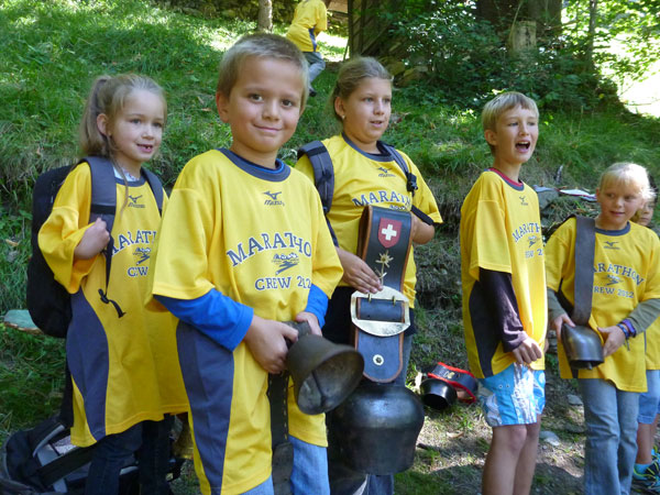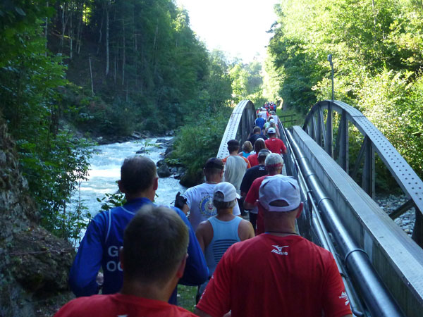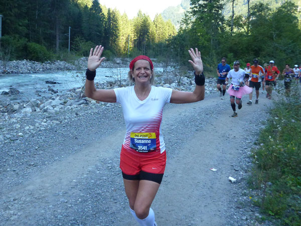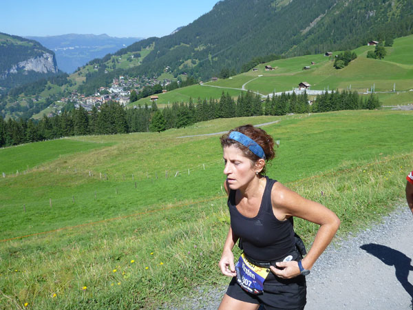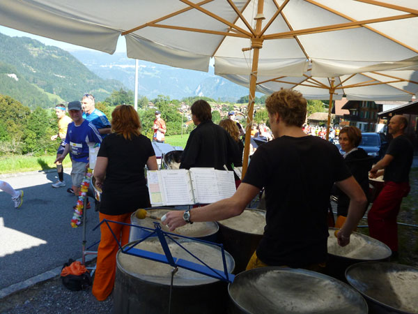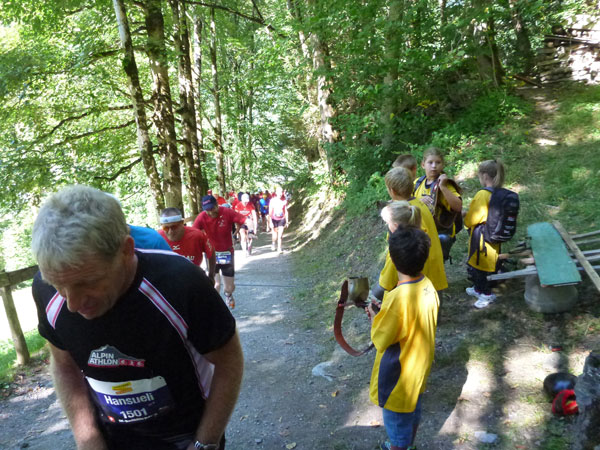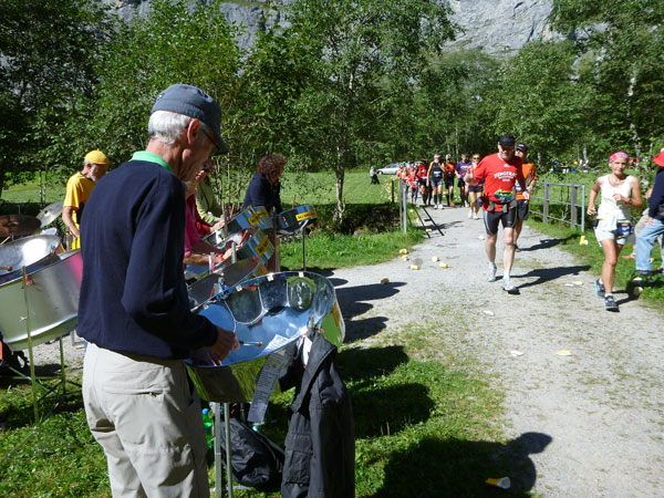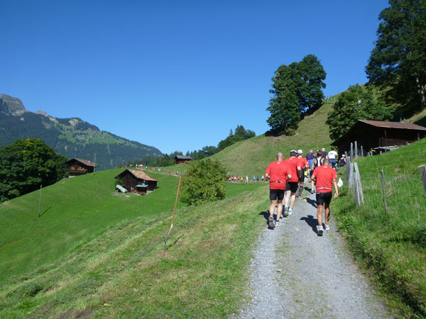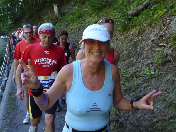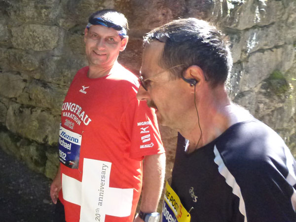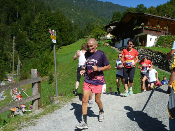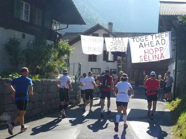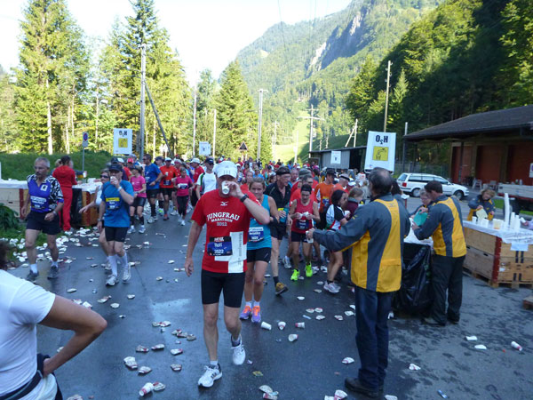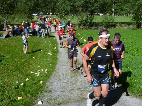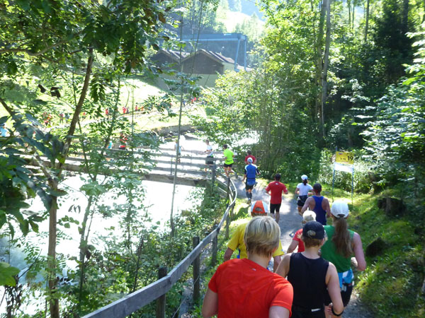 Die steigende Strecke und die Naturwege sorgen dafür, dass sich mein Tempo automatisch etwas verringert. In Lauterbrunnen (km 20) habe ich noch 4 Minuten plus auf meine Sollzeit. Na also, so langsam passt mein Tempo. Beim Ortsdurchlauf durch Lauterbrunnen steppt wie immer der Bär, viele Begleiter nehmen hier die Gelegenheit war, beim Zugwechsel in die Jungfraubahn einen Abstecher vom Bahnhof an die Laufstrecke zu machen und noch zusätzlich für Stimmung zu sorgen.