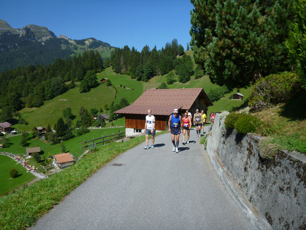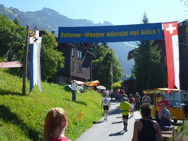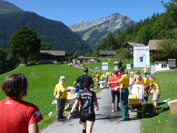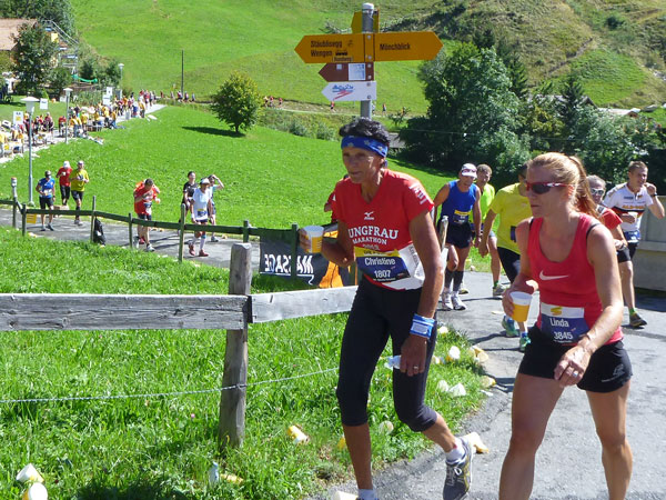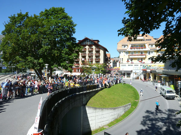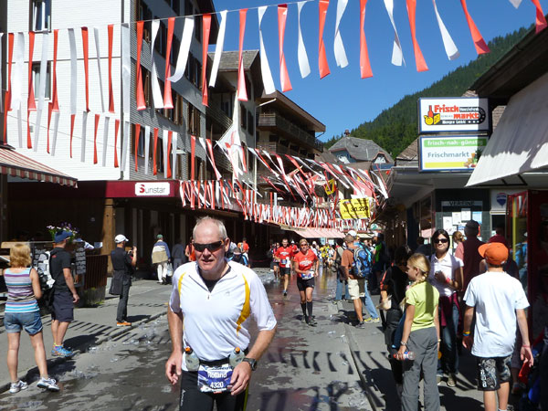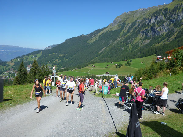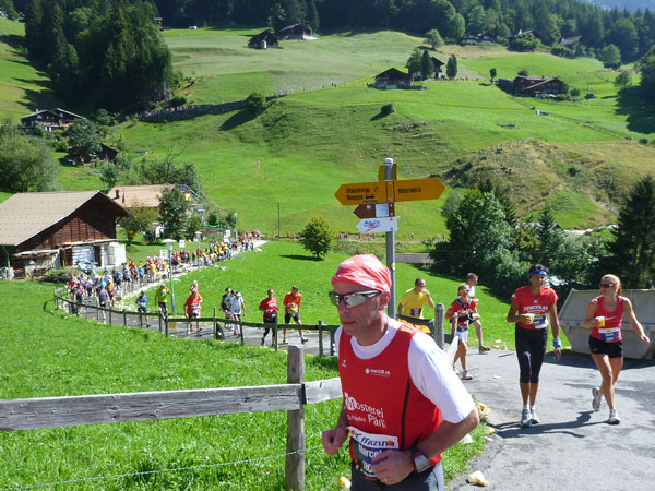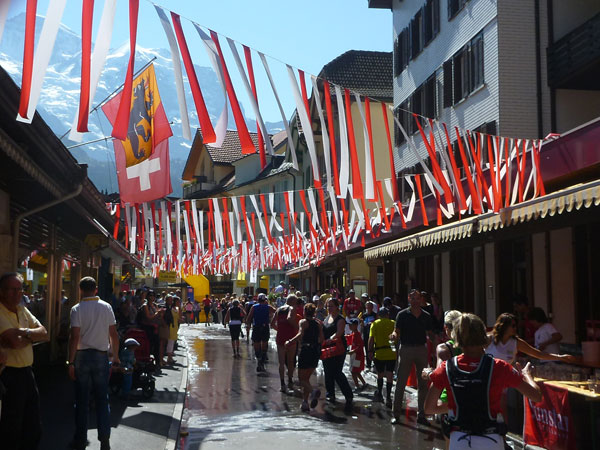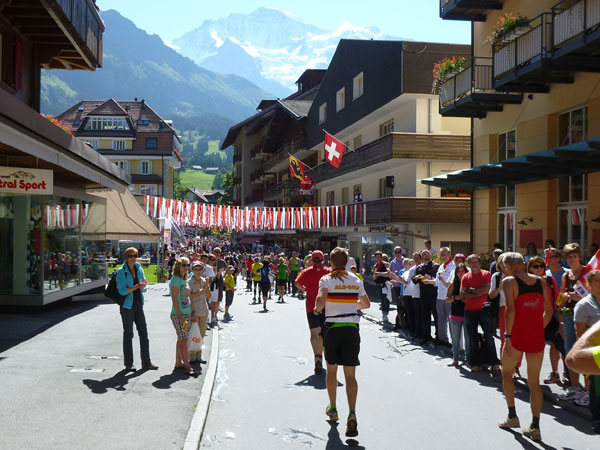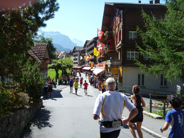 Der Durchlauf durch das mit Fahnen und Wimpeln geschmückt Wengen gleicht einem Triumphzug von Gladiatoren. Hunderte, was sag ich, tausende von Menschen stehen an der Seite und jubeln uns zu und dazu spielt die Musi. Man muss es einfach erlebt haben. Überrascht bin ich, dass ich an der 30km-Marke immer noch optimal in der Zeit liege. Meine Plusminuten vom Tal herauf konnte ich noch behalten. Wer auch immer diese Zeitentabellen programmiert, hat bisher gute Arbeit geleistet und das Steilstück optimal berücksichtigt.