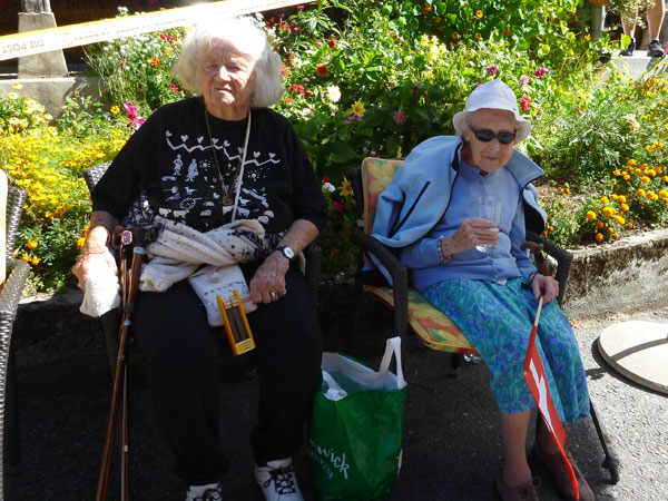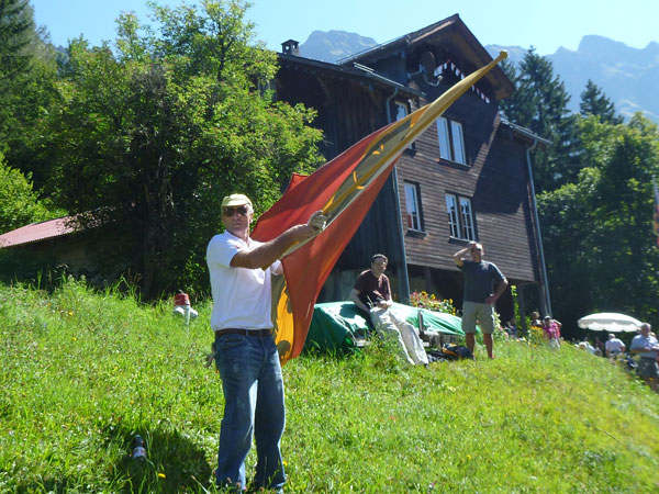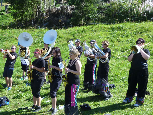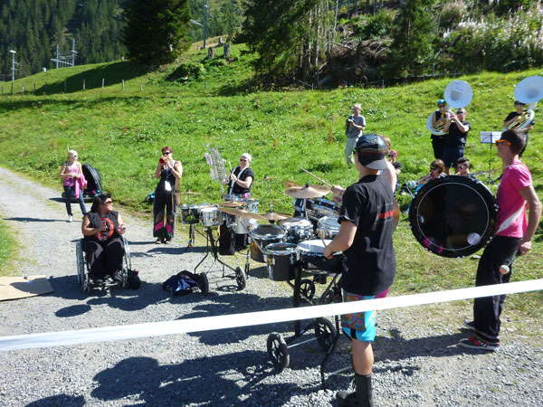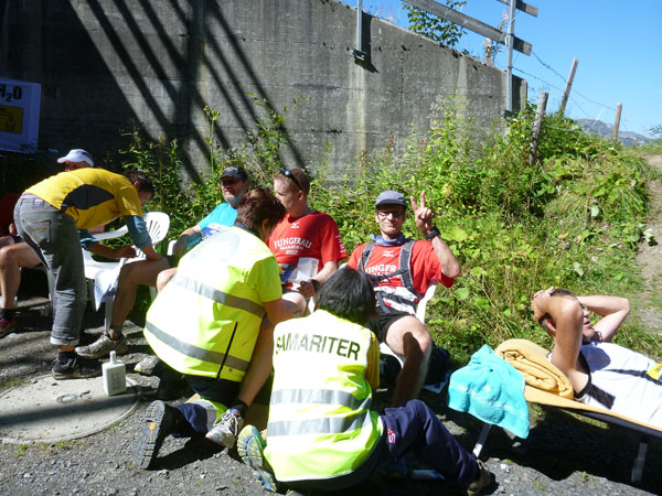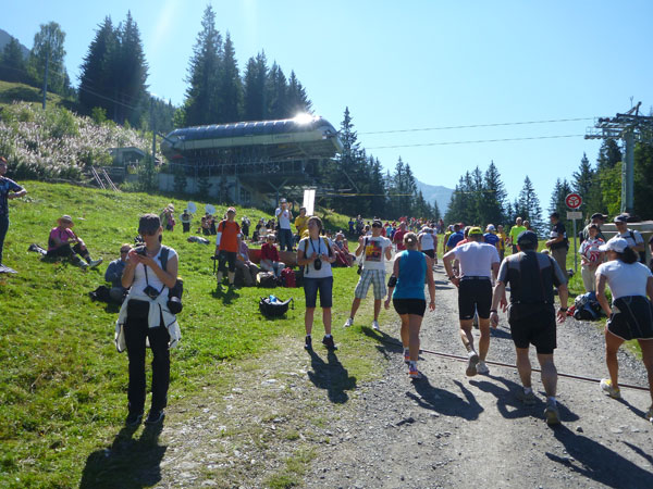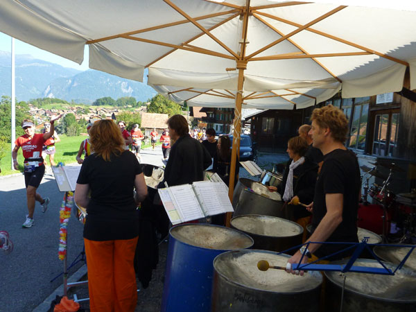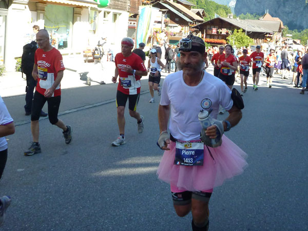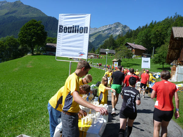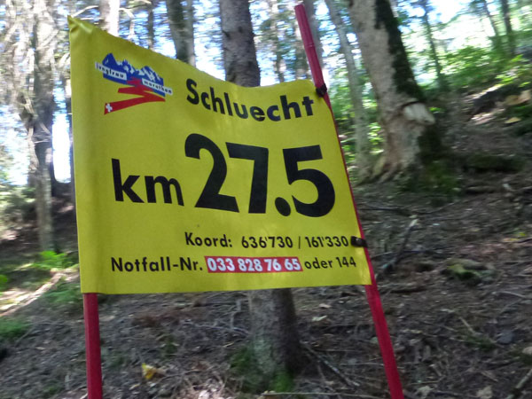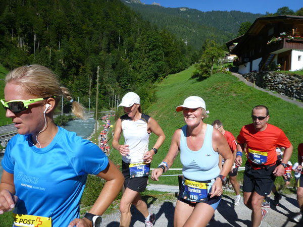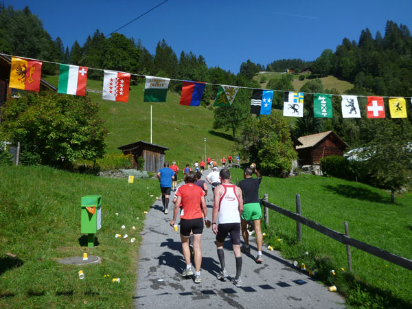 Der Durchlauf durch das mit Fahnen und Wimpeln geschmückt Wengen gleicht einem Triumphzug von Gladiatoren. Hunderte, was sag ich, tausende von Menschen stehen an der Seite und jubeln uns zu und dazu spielt die Musi. Man muss es einfach erlebt haben. Überrascht bin ich, dass ich an der 30km-Marke immer noch optimal in der Zeit liege. Meine Plusminuten vom Tal herauf konnte ich noch behalten. Wer auch immer diese Zeitentabellen programmiert, hat bisher gute Arbeit geleistet und das Steilstück optimal berücksichtigt.