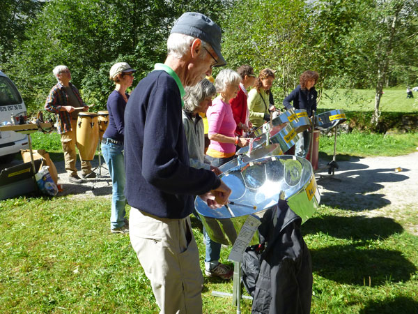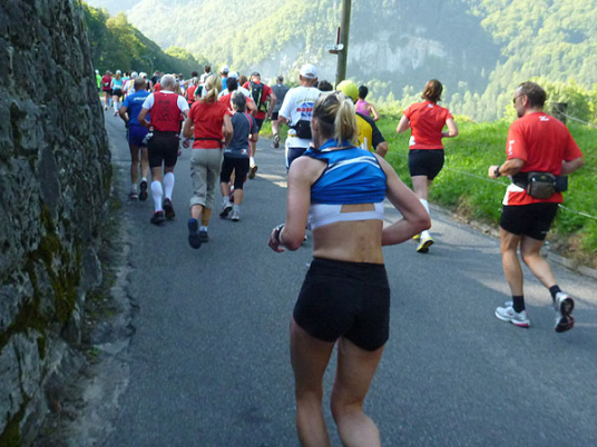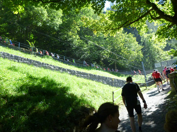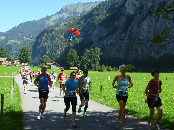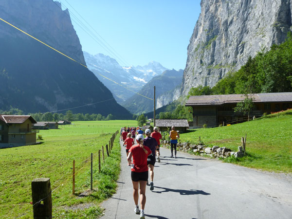 Etwas außerhalb von Lauterbrunnen ist die Halbmarathon-Matte erreicht. Eine kleine Schleife führt uns noch tiefer ins Tal der Wasserfälle. 72 stiebende Wasserfälle gibt es im Lauterbrunnental. Die bekanntesten sind der Staubbachfall mit 300 m Falltiefe und die Trümmelbachfälle. Eine unterirdische Standseilbahn, etliche Tunnels und Brücken erschließen die 10 Gletscherwasserfälle im Berginnern. Wer knapp in der Zeit liegt, für den bietet sich das fast 2 km lange Gefälle des Rückwegs aus dem Tal zum Tempo machen an.
