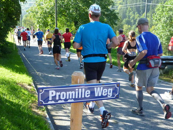 Zurück in Lauterbrunnen ist Schluss mit gepflegtem Laufen. Ab km 26 geht’s rein in die 3 km lange Wand, die uns in 26 Serpentinen nach Wengen führt und mich meist in den Gehschritt zwingt. Nicht umsonst werden ab hier bis zur Moräne die Kilometerschilder in 250-Meter-Schritten angezeigt. Gespannt bin ich, wie meine Marschtabelle die steilen Berganstiege einrechnet und ob dieses Tempo auch umsetzbar ist. Passenderweise läuft an einer Alm „Another Brick In The Wall“ von Pink Floyd in Dauerschleife. Vor drei Jahren kam mir der Abschnitt aber deutlich steiler und länger vor.