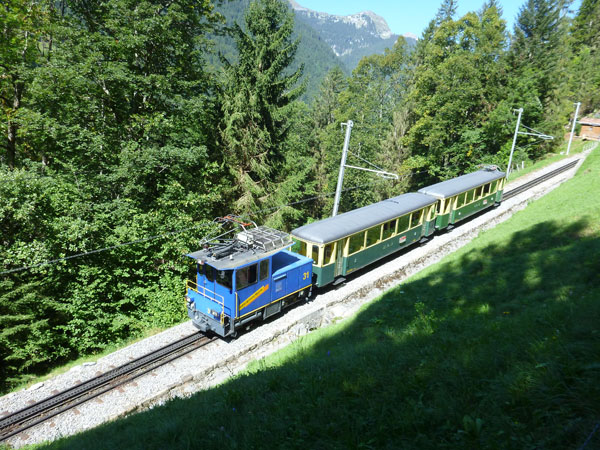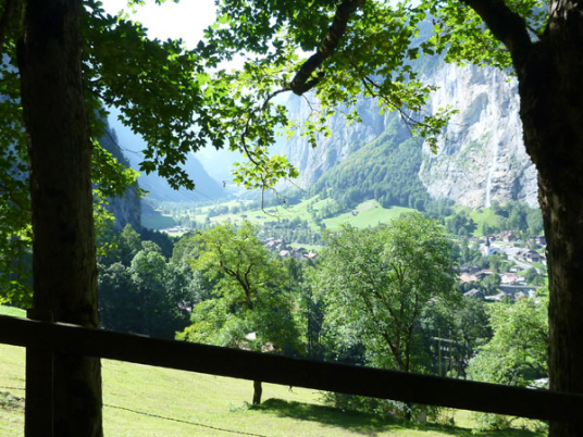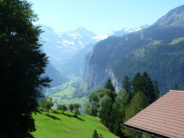 Spürbar leicht ansteigen wird es nach Gsteigwiler. Nach zwei wunderschönen alten Holzbrücken verlassen wir auch die geteerten Straßen und wechseln auf schmale Kieswege und Pfade über. Bis Lauterbrunnen kommen so fast 350 Höhenmeter zusammen. Mal rechts, mal links von uns werden wir begleitet von der Lütschine. In Zweilütschinen (km 15) ist der Zusammenfluß der Schwarzen Lütschine vom Grindelwaldgletscher und der Weissen Lütschine aus dem Lauterbrunnental kommend. In vergangenen Jahrhunderten sorgten die Flüsse immer wieder für große Überschwemmungen unten im Bödeli.