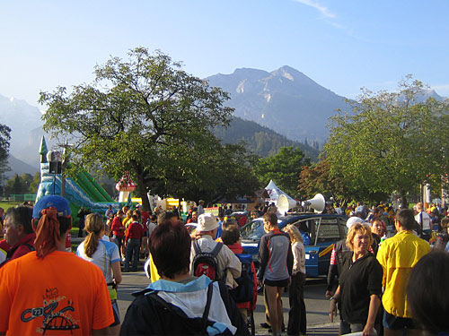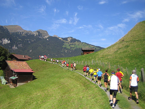 Nach dem Startschuss um 9.00 Uhr werden die Läufer erst einmal einige Kilometer durch Interlaken geführt, vorbei an Musikkapellen oder „Kuhglockenbands“. Als der Startbereich ein zweites Mal passiert wird, ermuntert der Moderator die Zuschauer, die Läufer/innen auf ihrem nicht ganz einfachen Weg mit dem nötigen Applaus zu begleiten („Die Hände sind heute zum Klatschen da“), der dann auch prompt folgt, aber doch noch ein wenig wie mit angezogener Handbremse, was man später nicht mehr behaupten kann. Immer wieder werden wir unterwegs von meist kleinen Gruppen angefeuert.