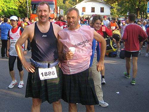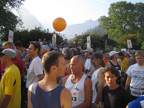 Der Wille, die Läufer bestmöglich zufrieden zu stellen, zeigt sich schon im Vorfeld des Laufes: So war es kein Problem, im Charlton-Hotel kurzfristig umzudisponieren, obwohl es ausgebucht war. Und auch für den, der sich erst zwei Wochen vorher zur Teilnahme an dem Lauf entscheiden konnte, war eine Startnummer frei. Also gemeinsame Anreise am Freitagabend mit Edzard Müller aus Nordhessen, der sich doch noch Zeit für den Lauf nehmen konnte. Am Samstagmorgen beginnt alles ganz normal: Frühstück im Hotel mit anderen Läufer/innen kurz nach 6.00 Uhr, Abholung der Startnummer im ca. 300 Meter entfernten Casino-Kursaal und Abgabe der Kleiderbeutel, die zur Kleinen Scheidegg transportiert werden müssen. Danach bleibt noch Zeit für einen kurzen Plausch mit bekannten Gesichtern. Und es wird immer deutlicher: Dieser Tag wird uns ein Traumwetter bescheren.