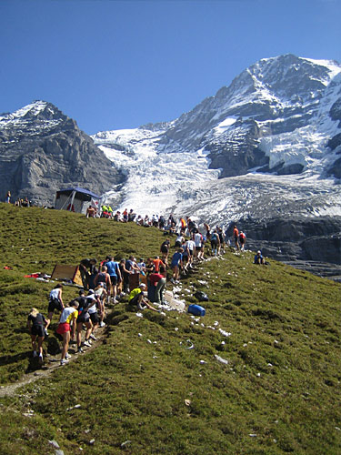 Dann zeigt sich die Eigergletscher-Moräne und wir wissen, der Anstieg ist noch einmal besonders giftig, aber es ist auch der letzte. Wunderbare Ausblicke auf Berge und Täler entschädigen auch hier für alle Strapazen, aber man muss doch besonders auf den unebenen, steinigen Boden achten (und auch auf den Vordermann, denn hier geht kaum noch eine/r richtig gerade aus). Aber Stürze gibt es nicht. Überholen ist so gut wie nicht möglich und macht auch keinen Sinn. Hat man ein paar Meter Vorsprung herausgeholt, schreit die Lunge nach einer Pause. Sowohl der Blick nach oben als auch der nach unten ist auf eine scheinbar endlose Läuferkarawane gerichtet. Und so urwüchsig giftig dieser Anstieg auch ist, er hat seinen ganz besonderen Reiz. Er ist im wahrsten Sinne des Wortes der Höhepunkt dieses Marathons.