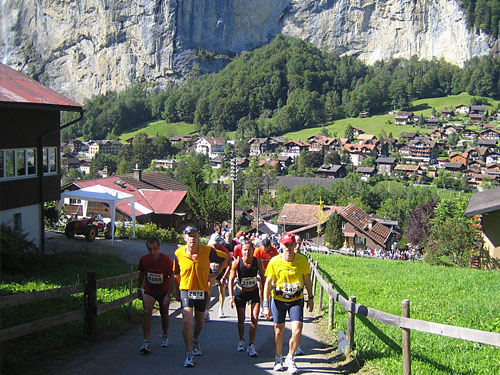 Nach einer Schleife wird die Lütschine wieder überquert, und weg ist das Bergpanorama. Wir laufen wieder zurück nach Lauterbrunnen. Ich frage mich, wann endlich die ersten richtigen Anstiege kommen. Fast 26 km sind absolviert, aber jetzt, als wir Lauterbrunnen zum zweiten Mal und frisch gestärkt verlassen, wird es ernst. Es folgen Serpentinen ohne Ende, meist durch Wälder, die zwischendurch noch einen Blick in das jetzt schon tief gelegene Lauterbrunnen gestatten. Noch gehen wir in flottem Schritt. Aber es dauert, bis der nächste Kilometer absolviert ist. Aber auch hierfür haben die Schweizer eine sympathische Lösung gefunden: Die zurückgelegte Strecke wird jetzt schon nach jeweils 500 oder sogar 250 Metern angezeigt.