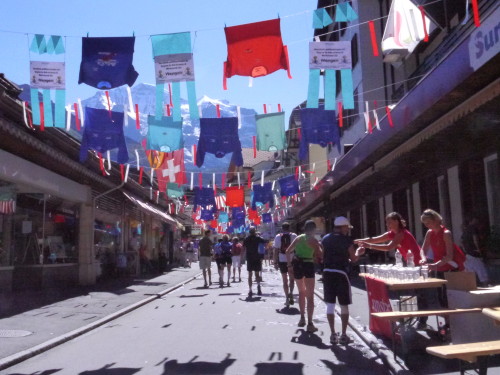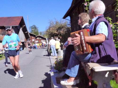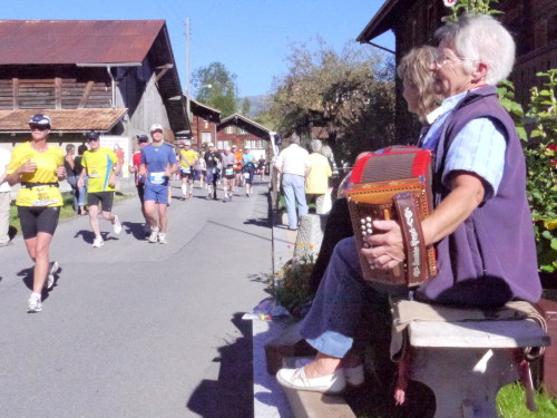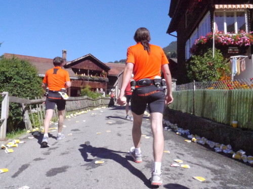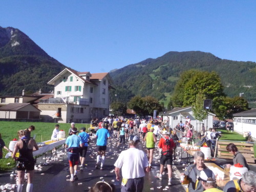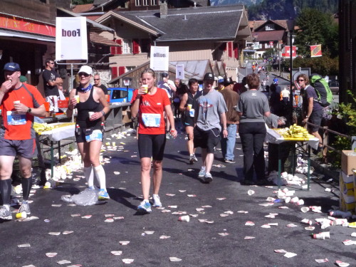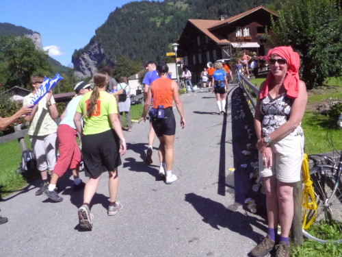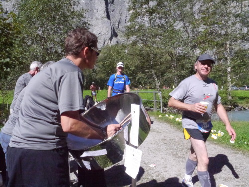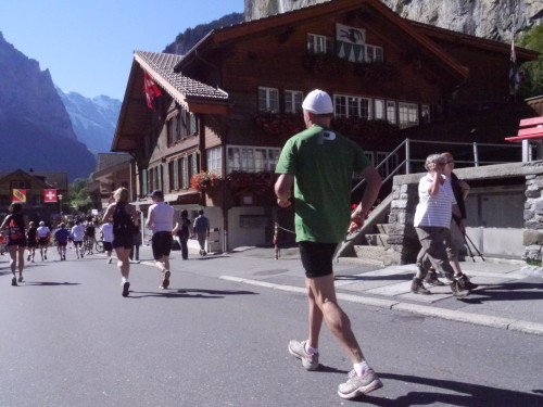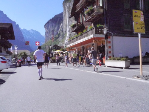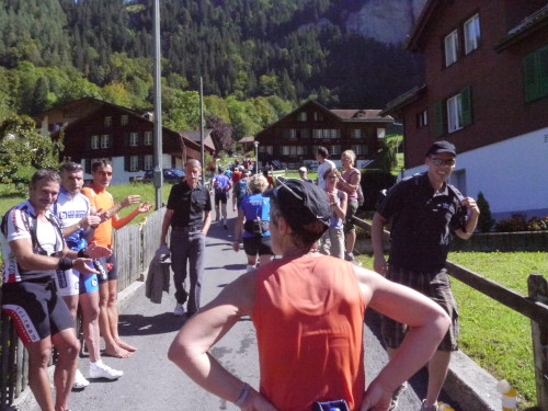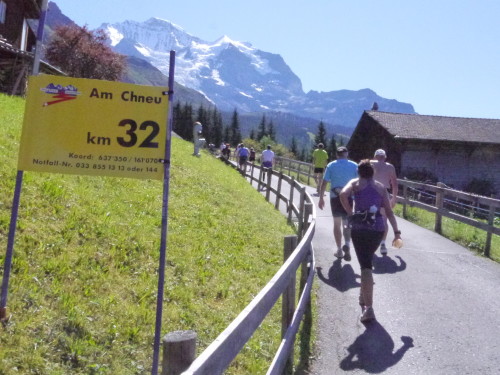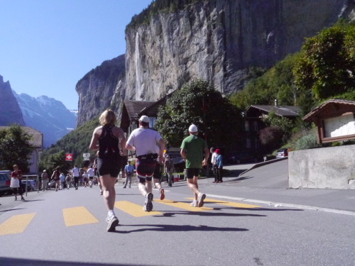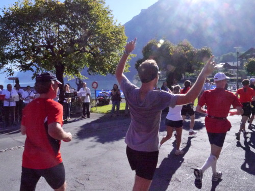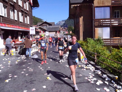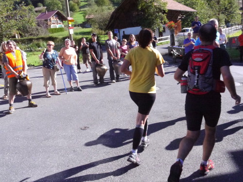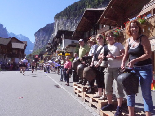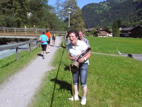 Die Stimmung in den Orten ist wie ich sie in Erinnerung habe: phantastisch, einmalig und nur mit den großen Citymarathons zu vergleichen. Lauterbrunnen (810 m – 19/25 km) ist der vorläufige Höhepunkt. Der Mix aus Glockengeläut, Guggen- und Blasmusik, Gekreische, Rufen und Applaus begleitet uns durch den ganzen Ort. Das Marathondorf steht Kopf. Du musst laufen, laufen, laufen. Die Zuschauer kennen keine Gnade. Dabei haben hier hinten im Feld bereits einige überreizt. Ich denke, da wird es heute noch viele Enttäuschungen geben. Auch bei mir wird das Zeitlimit erstmals ein Thema. Oder haben die Organisatoren ihrem Rat („Trinken, trinken“) vergessen den Hinweis anzufügen, dass man die Cut-off-Zeiten verlängert hat? Darauf spekuliere ich lieber nicht.