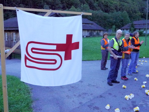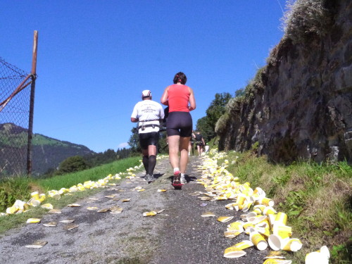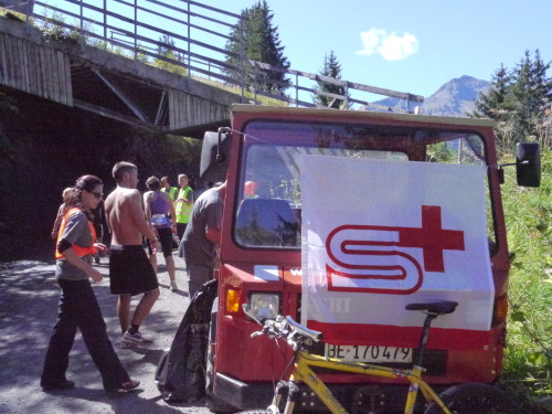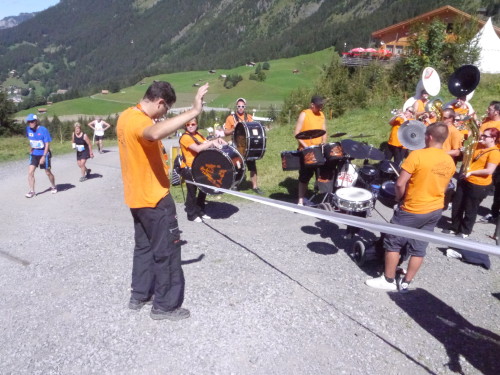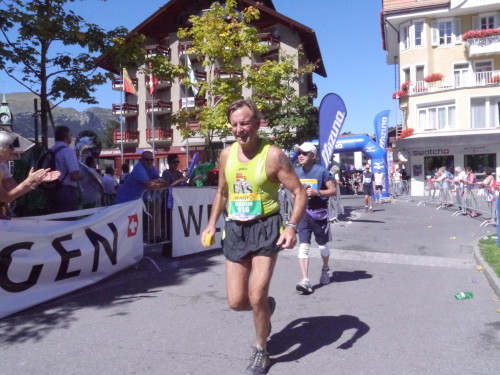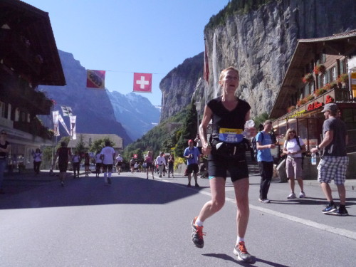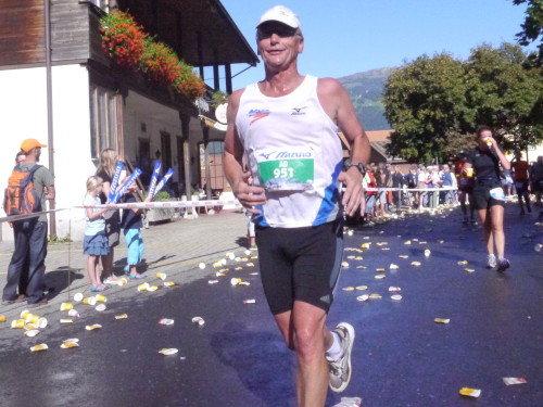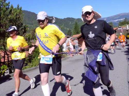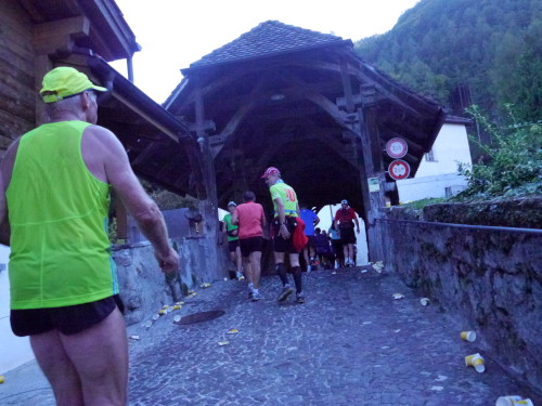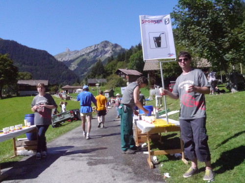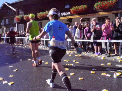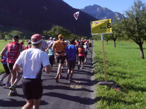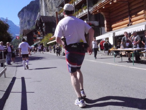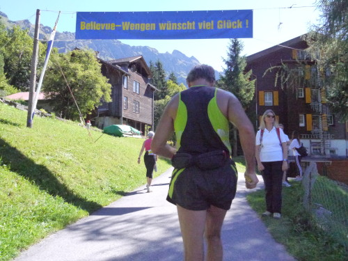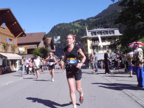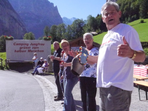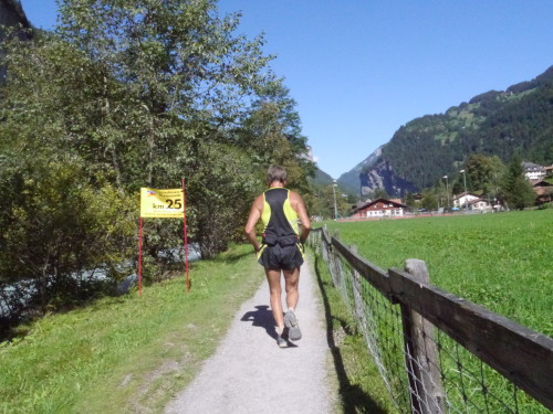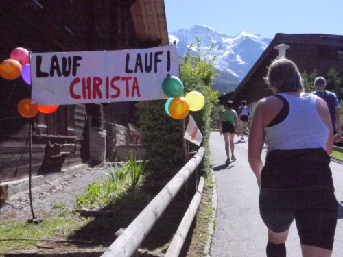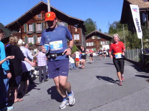 Die Stimmung in den Orten ist wie ich sie in Erinnerung habe: phantastisch, einmalig und nur mit den großen Citymarathons zu vergleichen. Lauterbrunnen (810 m – 19/25 km) ist der vorläufige Höhepunkt. Der Mix aus Glockengeläut, Guggen- und Blasmusik, Gekreische, Rufen und Applaus begleitet uns durch den ganzen Ort. Das Marathondorf steht Kopf. Du musst laufen, laufen, laufen. Die Zuschauer kennen keine Gnade. Dabei haben hier hinten im Feld bereits einige überreizt. Ich denke, da wird es heute noch viele Enttäuschungen geben. Auch bei mir wird das Zeitlimit erstmals ein Thema. Oder haben die Organisatoren ihrem Rat („Trinken, trinken“) vergessen den Hinweis anzufügen, dass man die Cut-off-Zeiten verlängert hat? Darauf spekuliere ich lieber nicht.