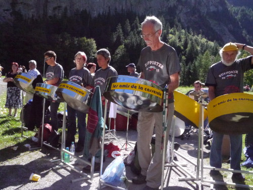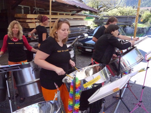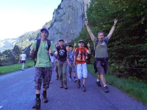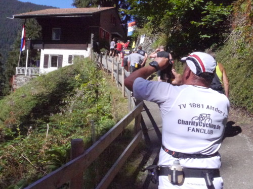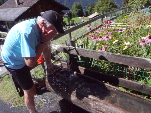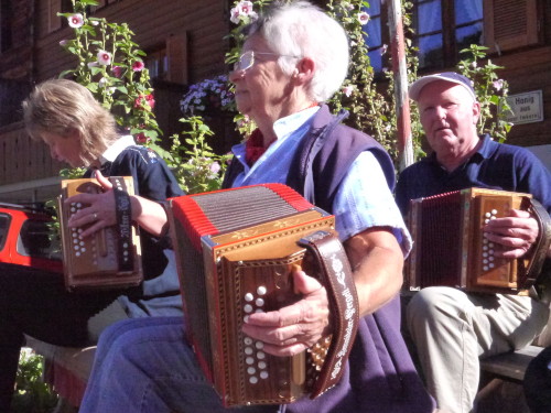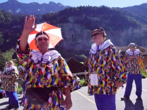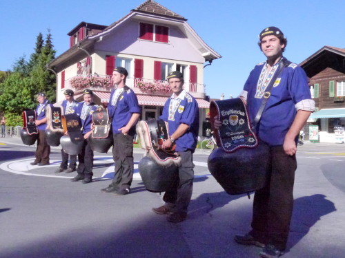 Für unsereiner heißt es „Gas geben“ bis Lauterbrunnen, danach kann man kaum noch Zeit gutmachen. Vor allem dann nicht, wenn es warm ist – so wie heute. Toll, wenn in einer solchen Situation die neue Kamera, das unbekannte Wesen, spinnt. Irgendwie habe ich versehentlich den Selbstauslöser aktiviert und kriege ihn nicht mehr aus. Gebrauchsanweisung habe ich natürlich nicht dabei und das Display kann ich in der Sonne nicht ablesen. Bei jedem Motiv 10 Sekunden auf den Auslöser warten? Unmöglich. In Bönigen, herrlich gelegen am Brienzer See, gelingen mir gerade mal zwei Schnappschüsse, die Burschen mit den riesigen Kuhglocken, die gar keine Glocken sondern Treicheln sind, bringe ich nur einmal auf den Chip. Die Leute denken, der Kerl im orangenen Shirt spinnt. Statt auf den Weg zu schauen, fummelt er an seiner Kamera rum. Einer fragt mich, ob ich auch dazu gehöre.