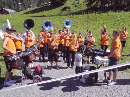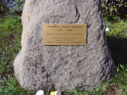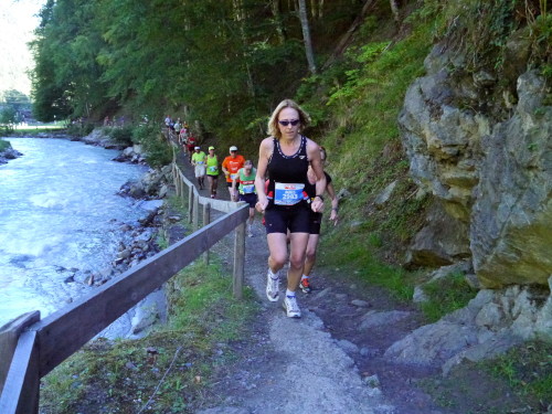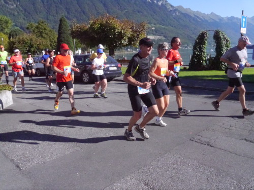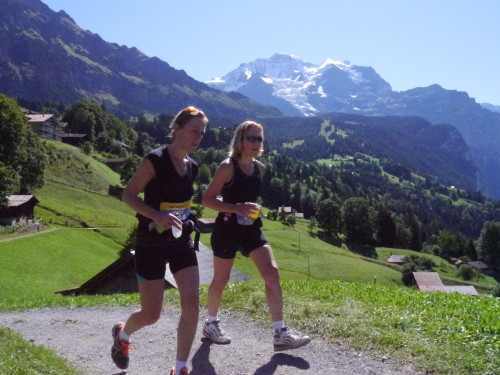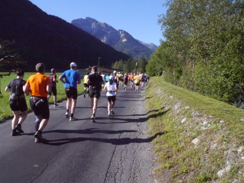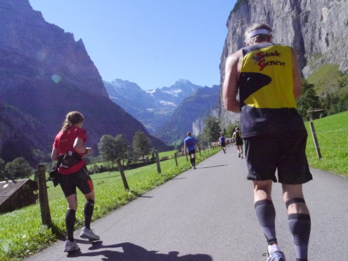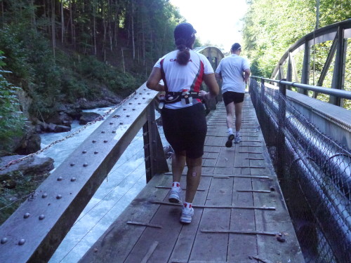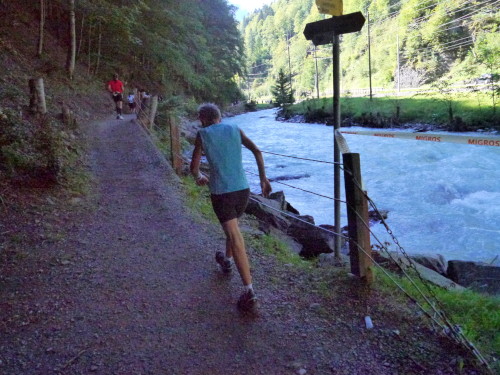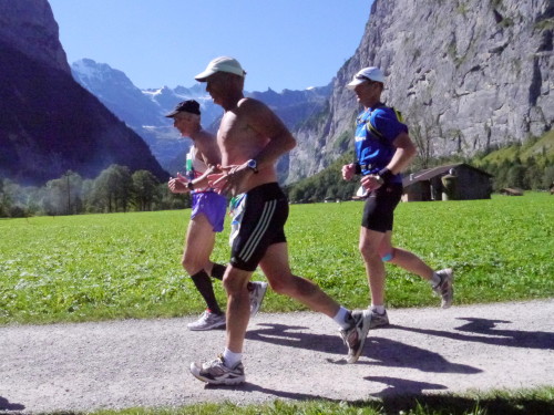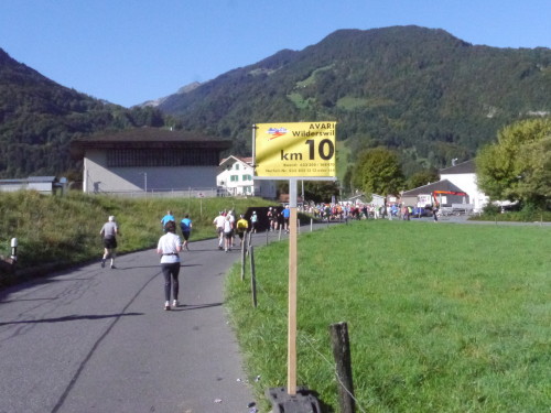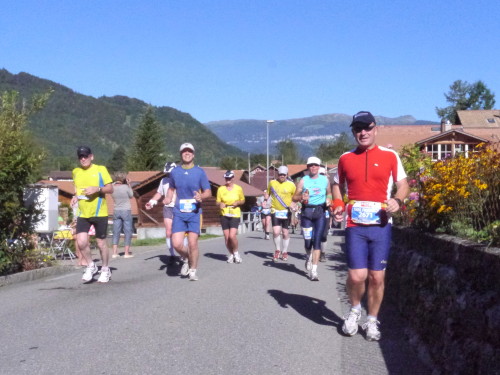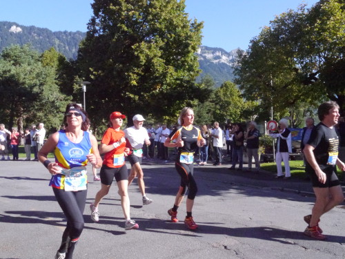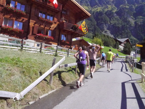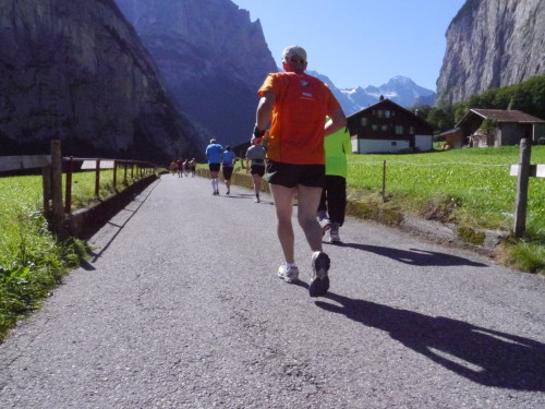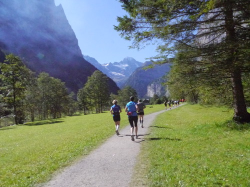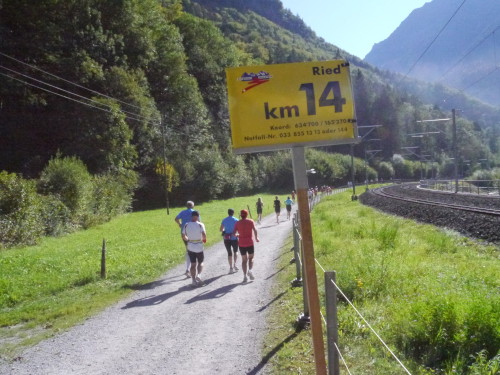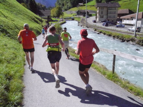 Entlang dem Flüsschen Lütschine laufen wir Richtung Wilderswil (585 m – 10 km). Nach der alten Holzbrücke kommt die erste nennenswerte Steigung. Vor den vielen Zuschauern will keiner Schwäche zeigen. Mit Schwung und fetziger Guggenmusik wird der Hang genommen. Bis Gsteigweiler und Zweilütschinen (652 m – km 15) geht es ohne Schwierigkeiten weiter. Der Ort kommt zu dem Namen, weil hier die Schwarze Lütschine (kommt aus Grindelwald) und die Weiße Lütschine (kommt aus dem Lauterbrunnental) zusammenfließen.