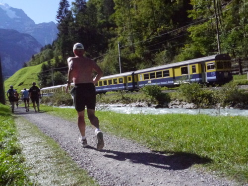 Alle 250 Meter wird jetzt die Distanz angezeigt. Unglaublich, wie lange 250 Meter sind. Vier Schilder sind ein Kilometer. Ich werde zur Schnecke. Teilweise geht es entlang der Wengernalmbahn, die die einzige Verkehrsverbindung zu dem autofreien Ort ist. An fast jeder Kehre stehen Kinder mit Kuhglocken. Es ist pausenlos am Bimmeln. Mancher Läufer entzieht sich der Hatz und macht ein Päuschen im Schatten. Andere hängen über dem Geländer und übergeben sich. Rainer hat meinen Vorsprung wettgemacht und zieht an mir vorbei. Ein Gutes hat dieser Streckenabschnitt: Er liegt im Schatten.