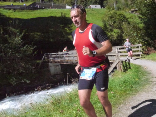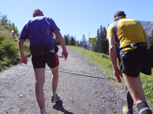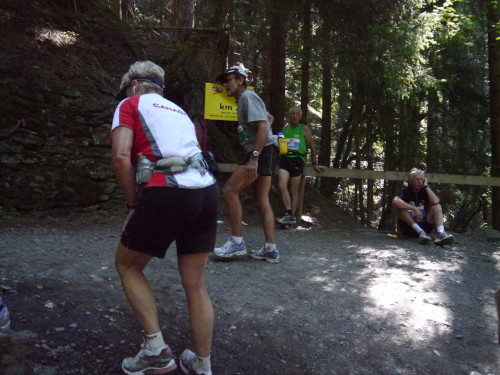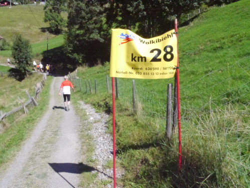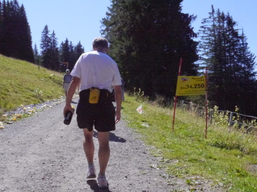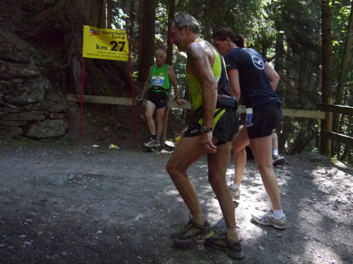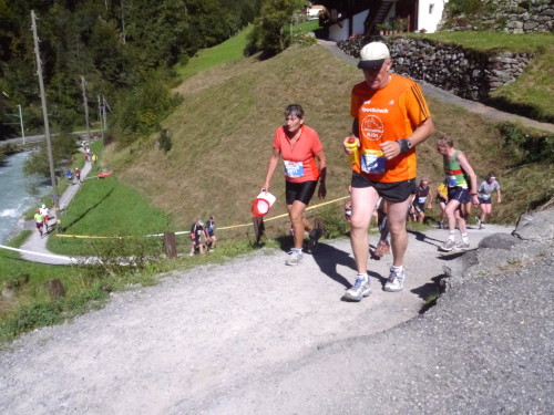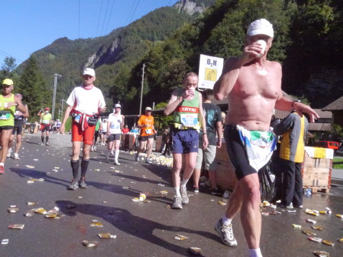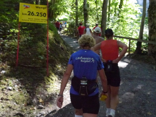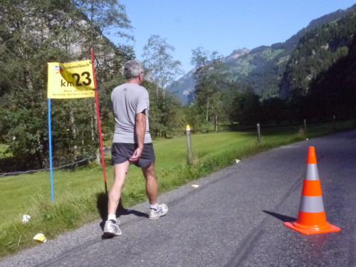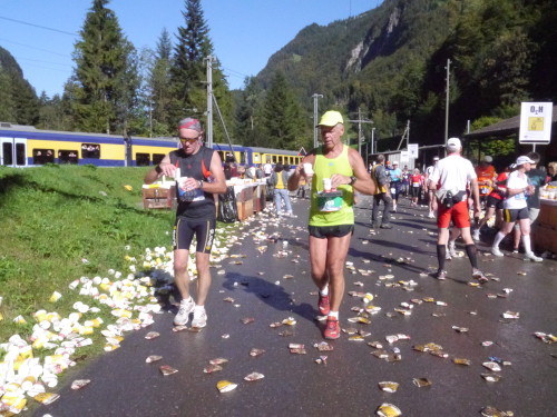 Nach langer, langer Zeit treffe ich mal wieder Rainer Satzinger. Schnell war er noch nie, aber schon immer extrem ausdauernd. Meine Bedenken wegen des Zeitlimits teilt er nicht. Knapp? Vielleicht. Zu knapp? Never! Ich gebe jedenfalls auf der abschüssigen Verkehrsstraße zurück nach Lauterbrunnen Gas, bis dann kurz vor km 26 für mich aus dem Lauf endgültig ein Marsch wird. Bevor es durch den Wengwald in 26 Kehren steil hinauf in den Wintersportort Wengen (1.284 – 30 km) geht, gibt es noch einmal reichlich Verpflegung.