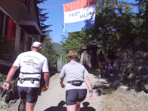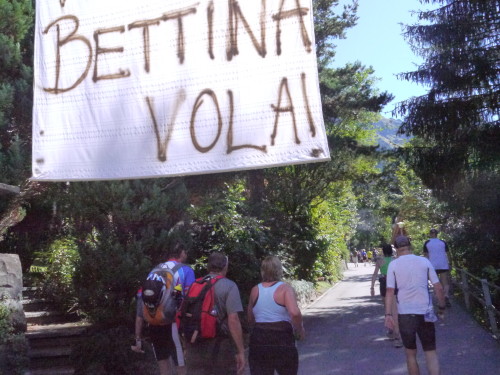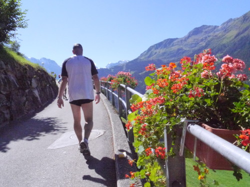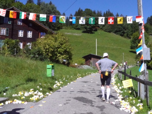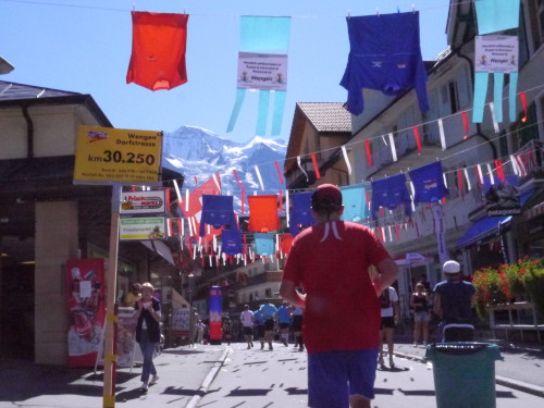 Verrückt, was sich in Wengen abspielt. Jedes Jahr denken sich die Leute einen anderen Straßenschmuck aus. Dieses Jahr hängen die Finisher-Shirts der 18 vergangen Jungfrau-Marathons über der Straße. Auch jetzt sind noch sehr viele Zuschauer an der Strecke, man wird gefeiert wie ein heimkehrender Olympiasieger. Das Laufen tut gut, entspannt die vom Aufstieg strapazierten Muskeln, dauert nur nicht lange, dann ist die kleine Schleife um den bekannten Skiort beendet und hinauf über Allmend zur Wengernalm wird wieder marschiert.