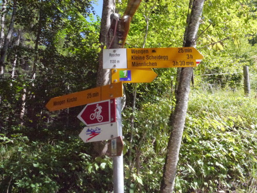 Der breite aber steile Weg quert die Piste des weltberühmten Lauberhornrennens. Dann kommen die weißen Zacken der Jungfrau ins Blickfeld. Vor genau 200 Jahren, 1811 wurde der 4158 m hohe Berg von Johann Rudolph und Hieronymus Meyer erstmals bestiegen. Viel später erst, 1857, gelang die Erstbesteigung des Mönch durch Christian Almer aus Grindelwald, der auch mit dem Matterhornbezwinger Edward Whymper unterwegs war. Ein Jahr später stand er als erster Mensch auch auf dem Eiger (3970 m).