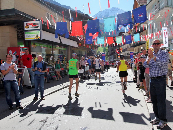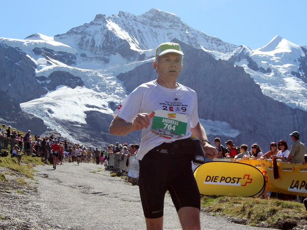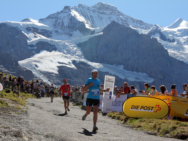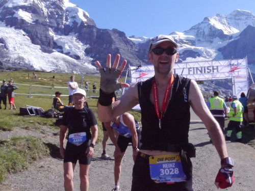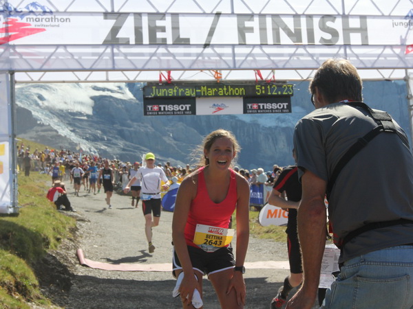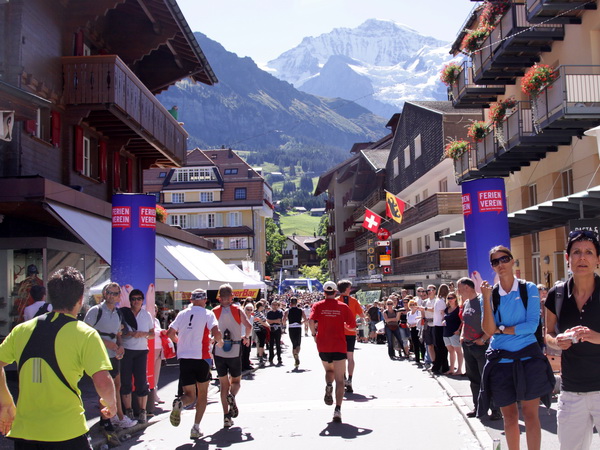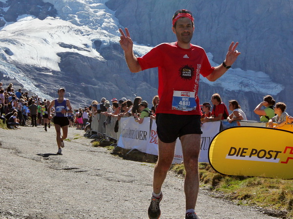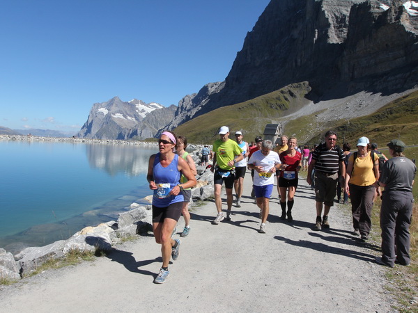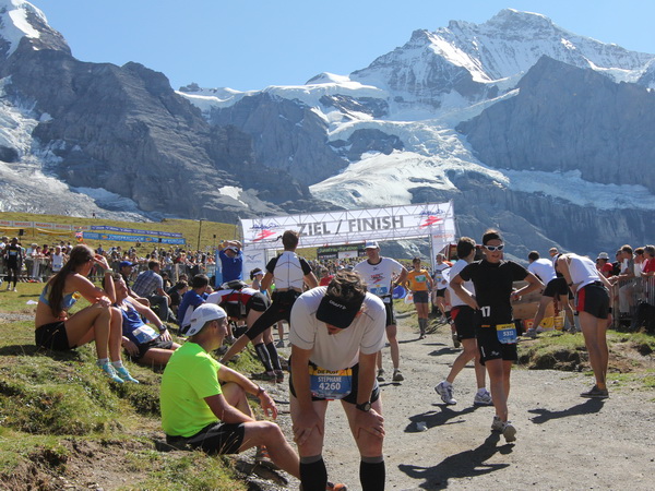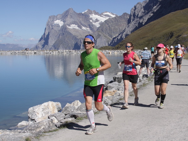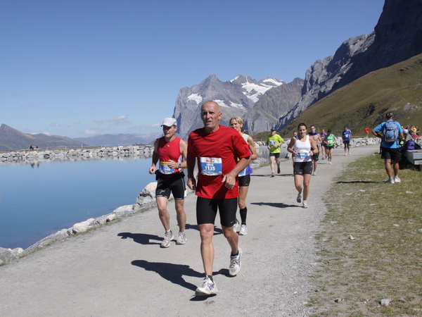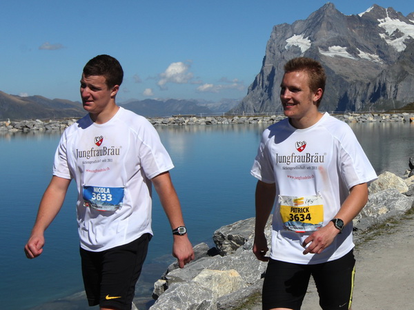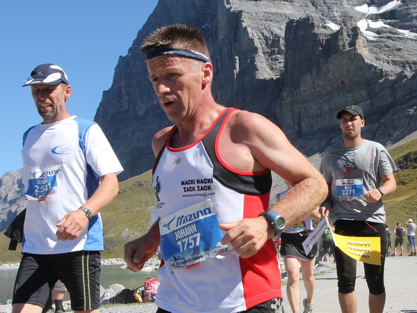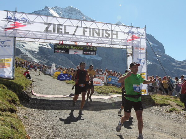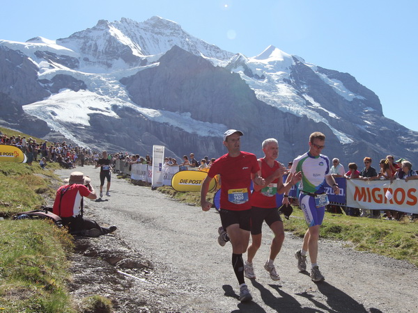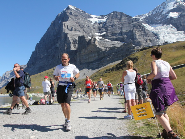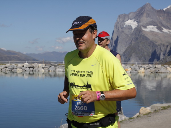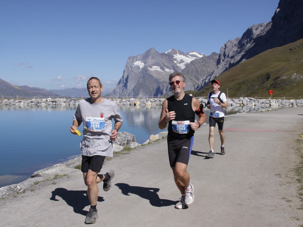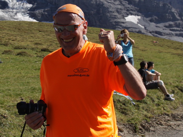 Der Weg ist breit und bequem. Malerisch liegen der See und die Kapelle in der Sonne. Die mächtigen Bergriesen Eiger, Mönch und Jungfrau bilden eine traumhafte Kulisse. Km 42 – noch 195 Meter. Ich will noch ein paar Fotos schießen – keine Chance. Rolf packt mich an der Hand und zusammen rennen wir ins Ziel. Ich hab‘s geschafft. Mit Hängen zwar, aber ohne Würgen.