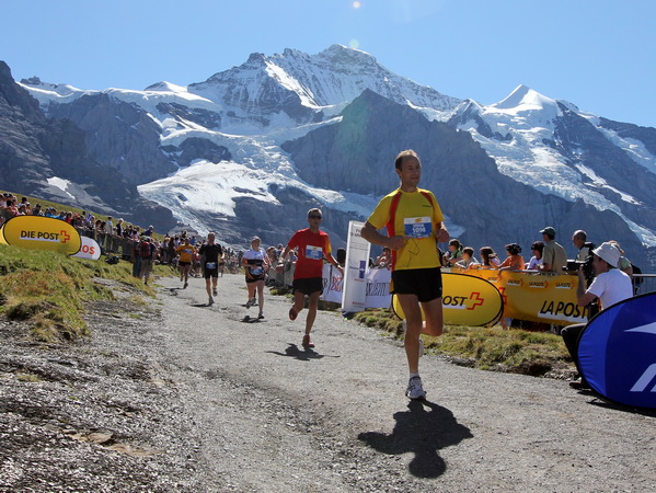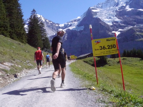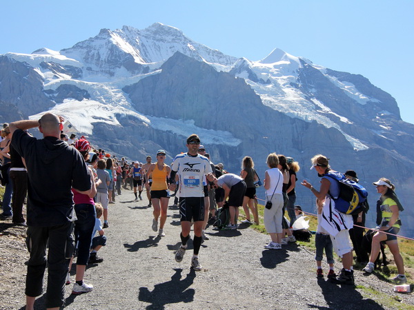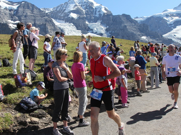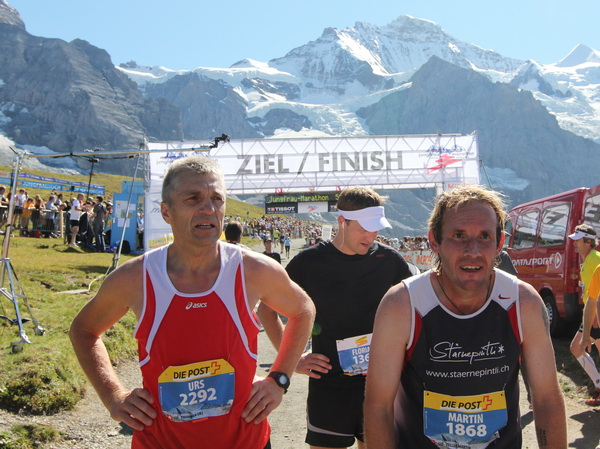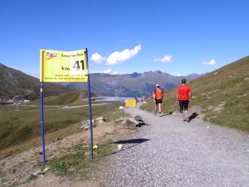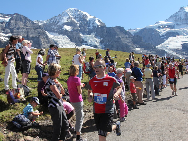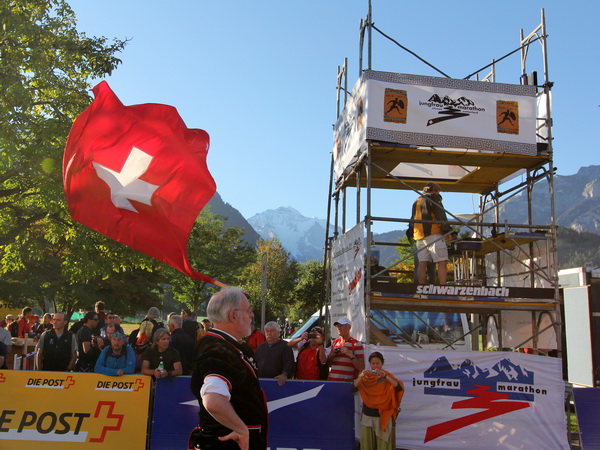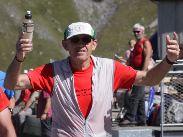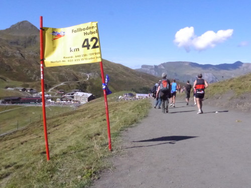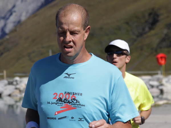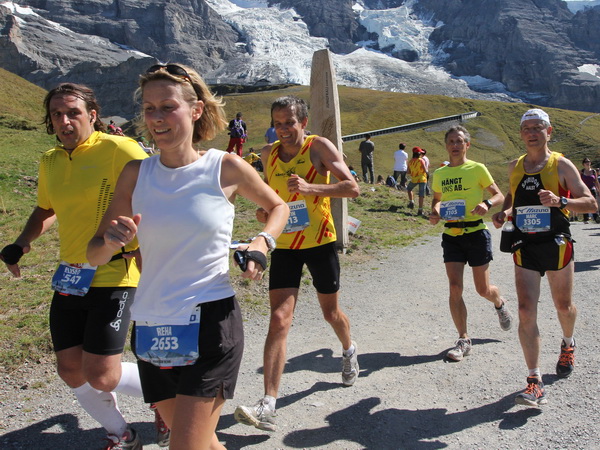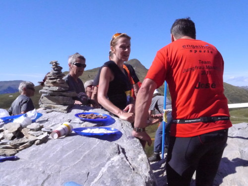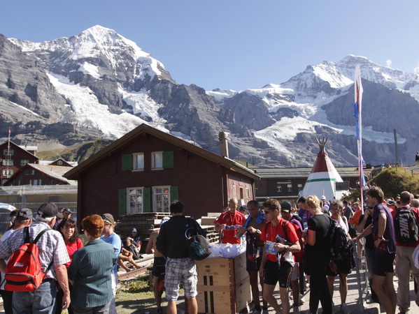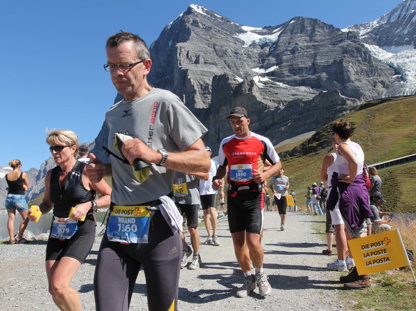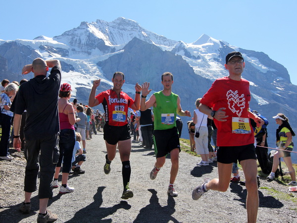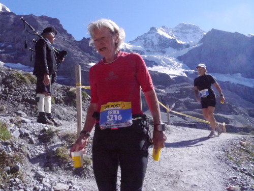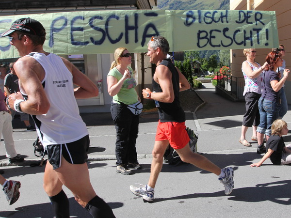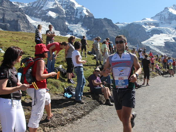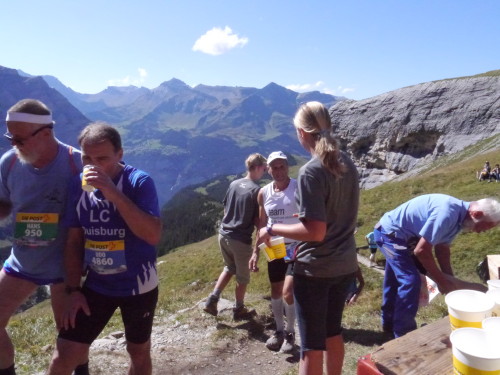 Auf halbem Weg wird noch einmal Wasser ausgeschenkt. Endlich erreichen wir den höchsten Punkt (Loucherflue 2205 m - km 40,8). Eine Gedenktafel erinnert an die Jungfrau-, NY- und Frankfurt-Marathon-Siegerin Franziska Rochat-Moser. Sie kam 2002 bei einem Lawinenunglück ums Leben. Man sollte eine weitere Gedenktafel anbringen. Für Roman Käslin nämlich. 2009 war er als Mountain-Piper zum letzten Mal im Einsatz, letztes Jahr im Mai starb er. Er war so etwas wie das Wahrzeichen des Jungfrau-Marathons. Seine Stelle nimmt jetzt Seppli Rast ein. „Willkommen, Seppli“. „Willkommen, Klaus.“