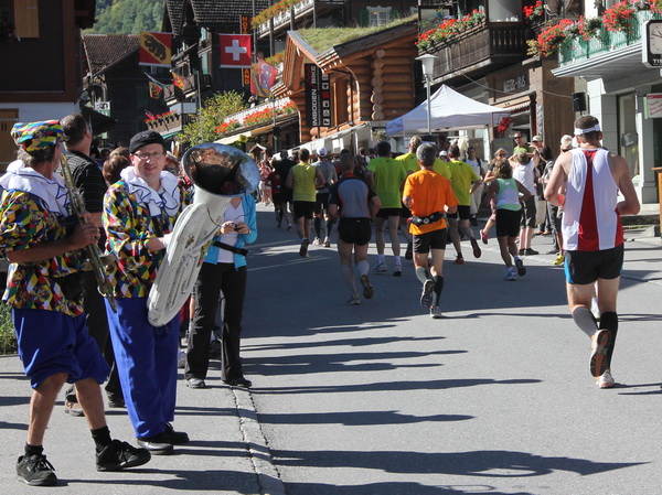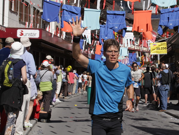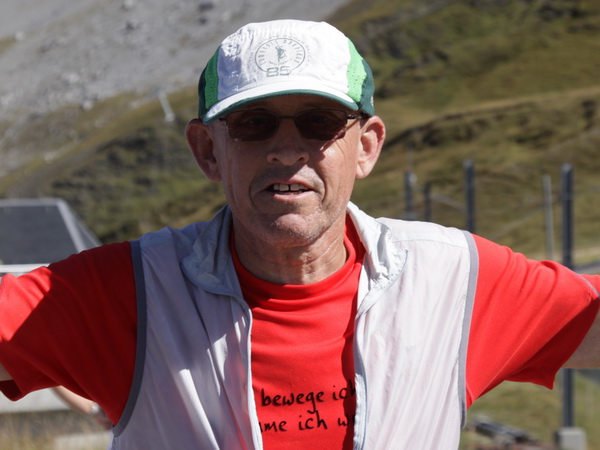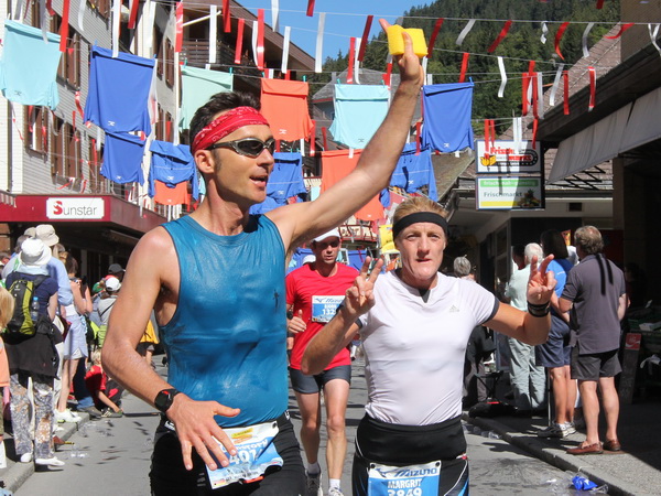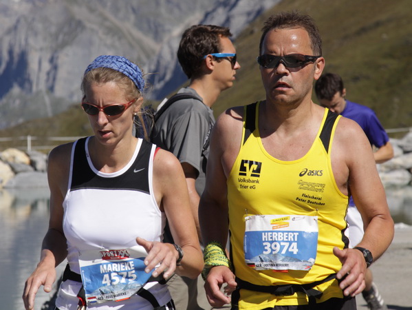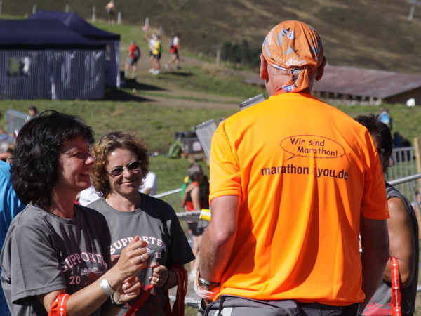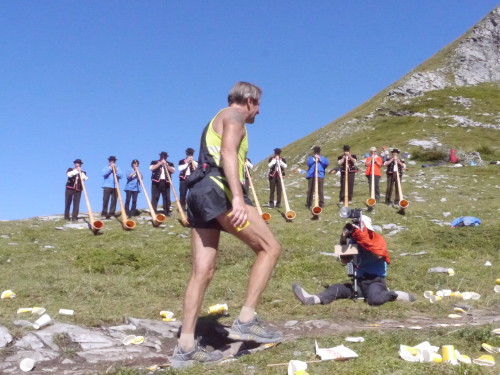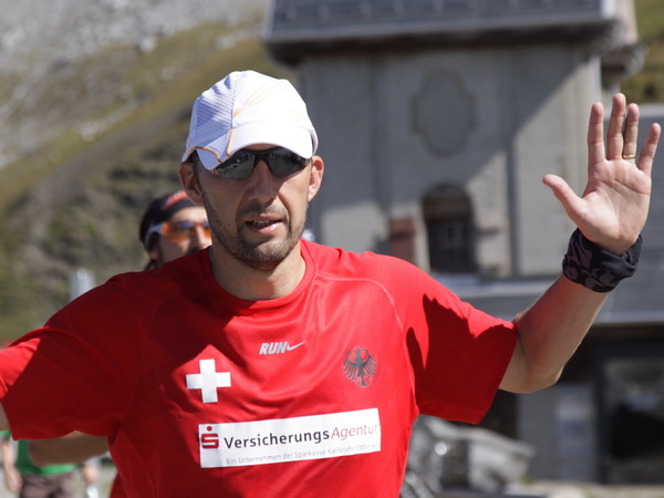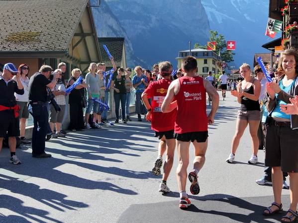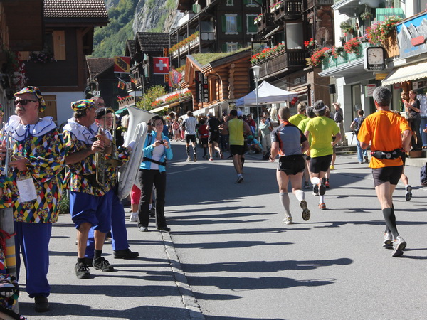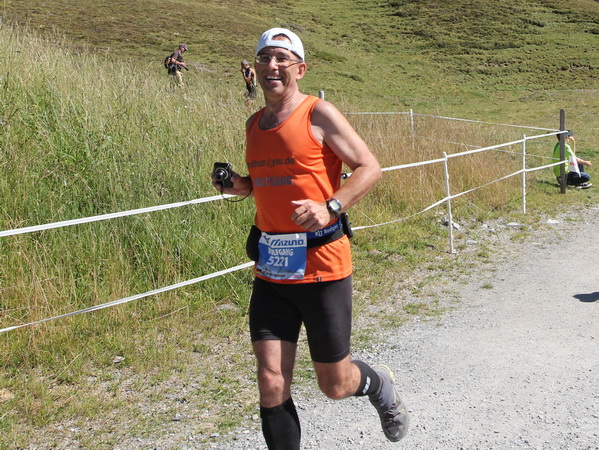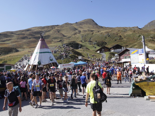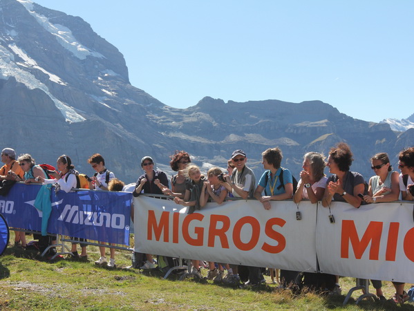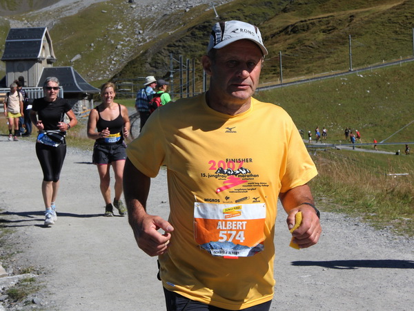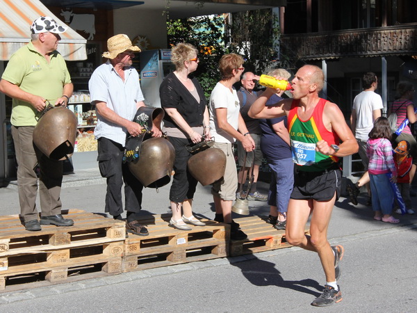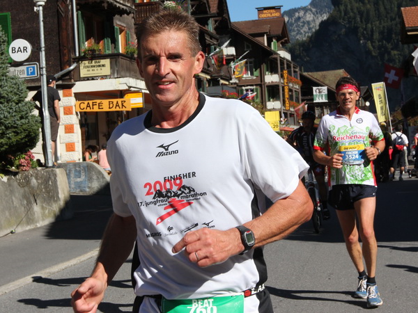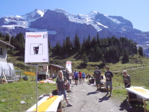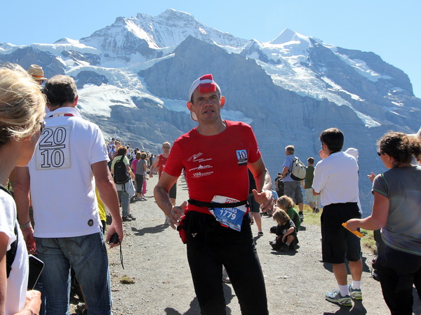 Auf halbem Weg wird noch einmal Wasser ausgeschenkt. Endlich erreichen wir den höchsten Punkt (Loucherflue 2205 m - km 40,8). Eine Gedenktafel erinnert an die Jungfrau-, NY- und Frankfurt-Marathon-Siegerin Franziska Rochat-Moser. Sie kam 2002 bei einem Lawinenunglück ums Leben. Man sollte eine weitere Gedenktafel anbringen. Für Roman Käslin nämlich. 2009 war er als Mountain-Piper zum letzten Mal im Einsatz, letztes Jahr im Mai starb er. Er war so etwas wie das Wahrzeichen des Jungfrau-Marathons. Seine Stelle nimmt jetzt Seppli Rast ein. „Willkommen, Seppli“. „Willkommen, Klaus.“