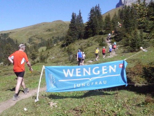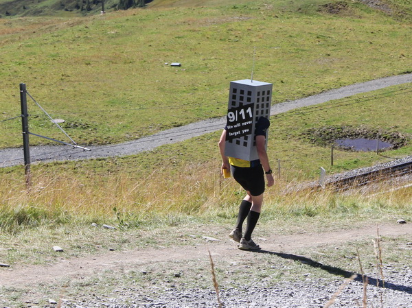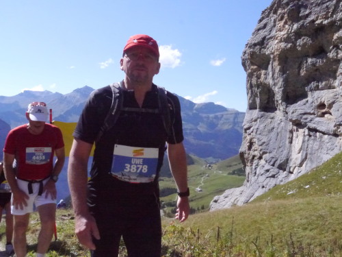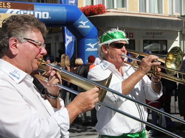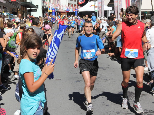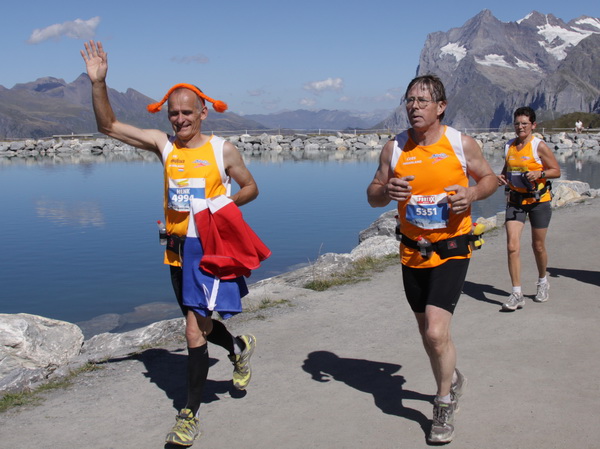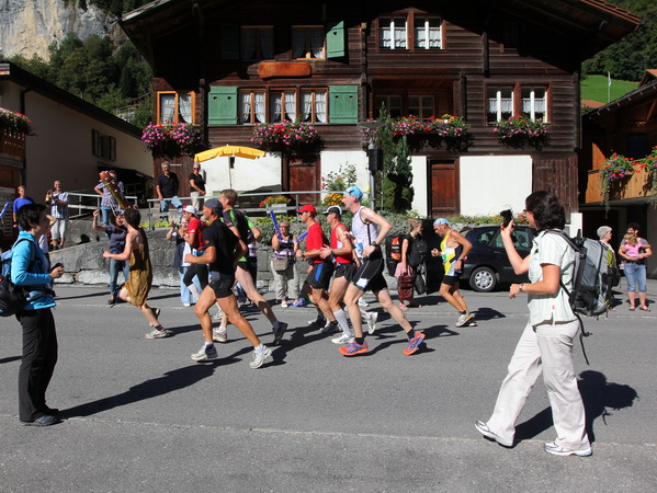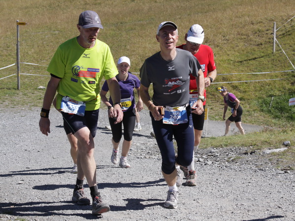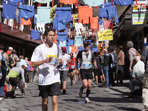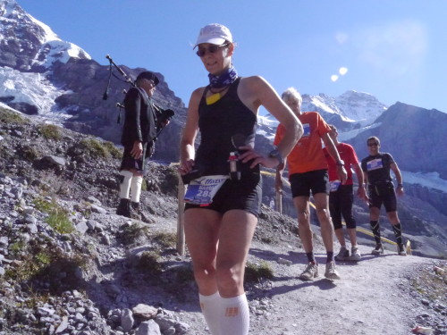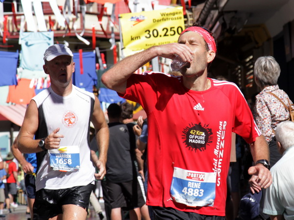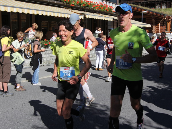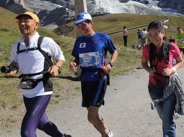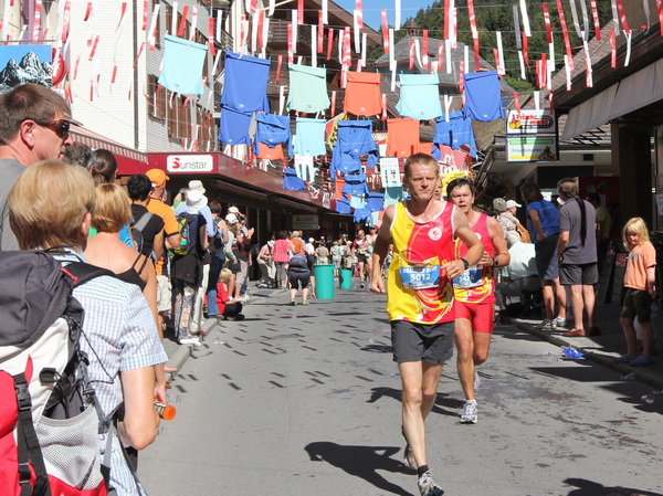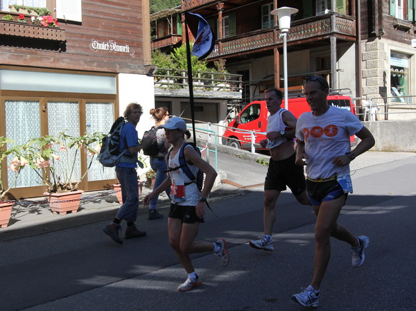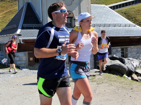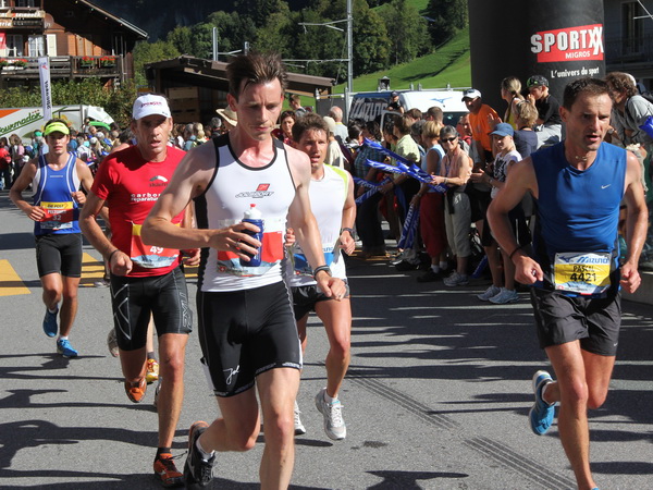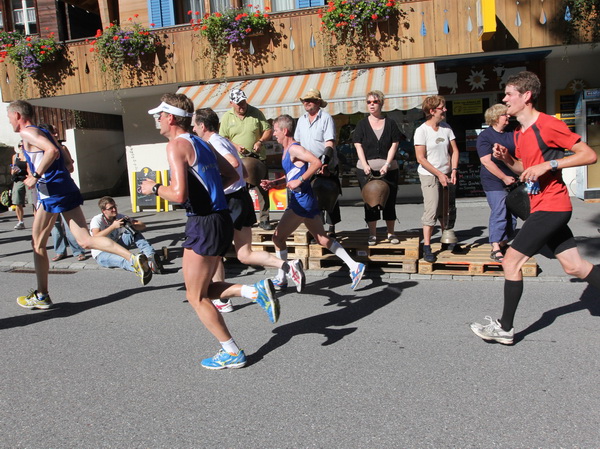 Auf halbem Weg wird noch einmal Wasser ausgeschenkt. Endlich erreichen wir den höchsten Punkt (Loucherflue 2205 m - km 40,8). Eine Gedenktafel erinnert an die Jungfrau-, NY- und Frankfurt-Marathon-Siegerin Franziska Rochat-Moser. Sie kam 2002 bei einem Lawinenunglück ums Leben. Man sollte eine weitere Gedenktafel anbringen. Für Roman Käslin nämlich. 2009 war er als Mountain-Piper zum letzten Mal im Einsatz, letztes Jahr im Mai starb er. Er war so etwas wie das Wahrzeichen des Jungfrau-Marathons. Seine Stelle nimmt jetzt Seppli Rast ein. „Willkommen, Seppli“. „Willkommen, Klaus.“
