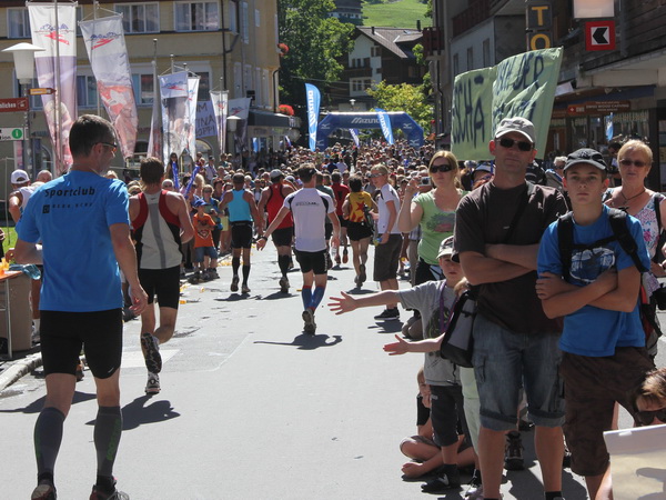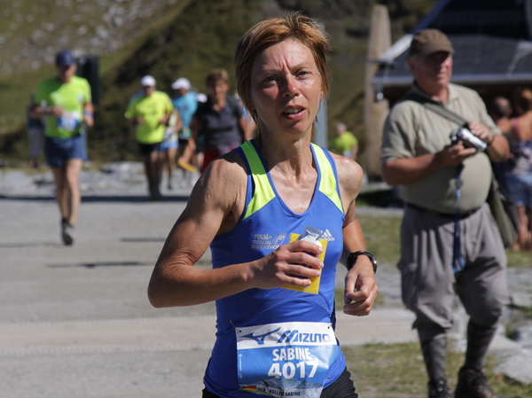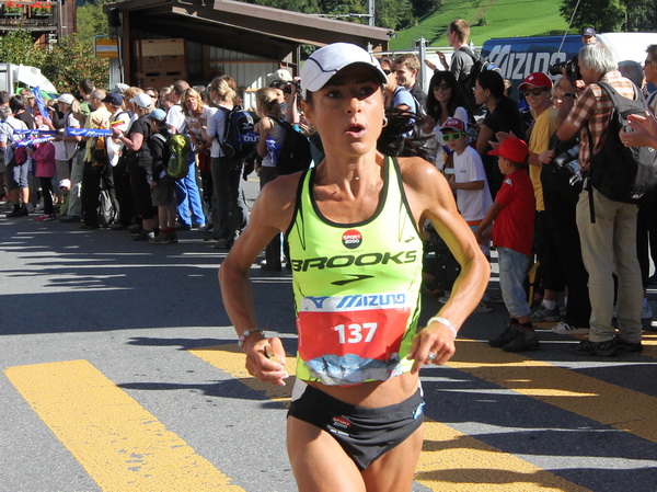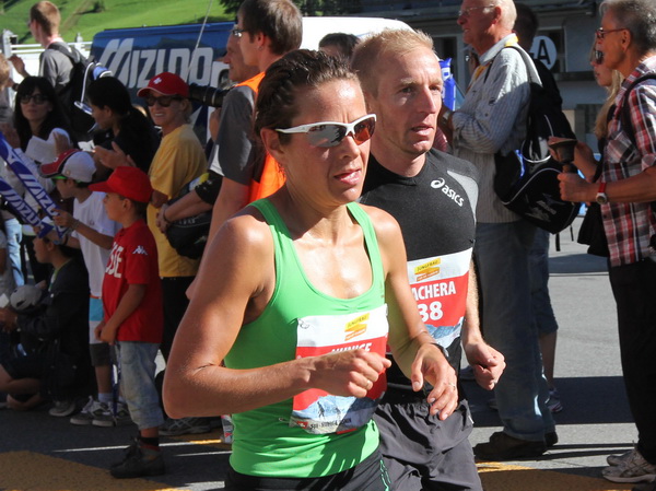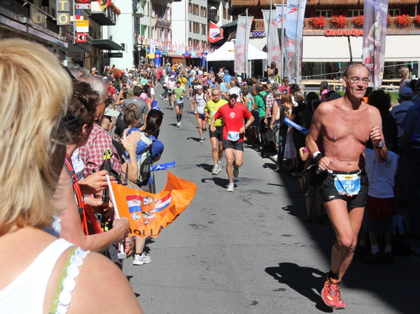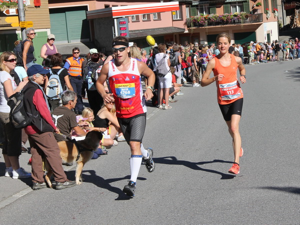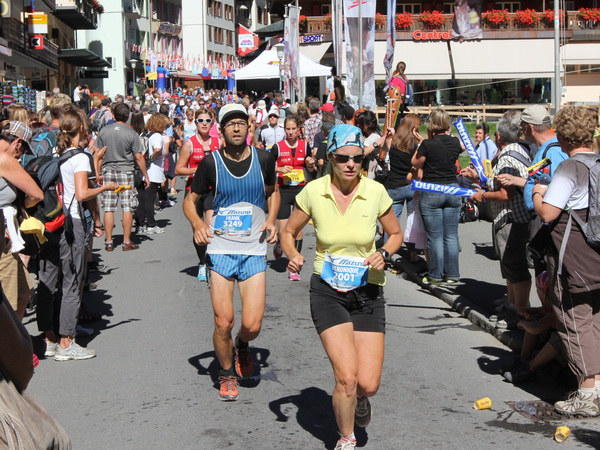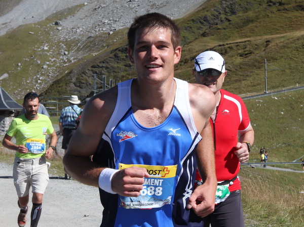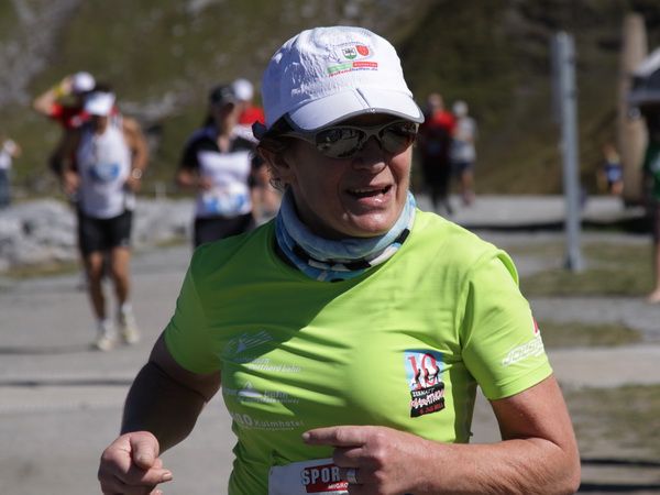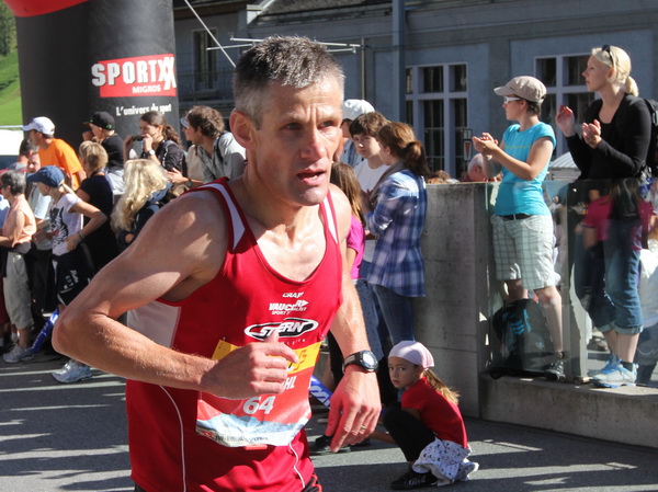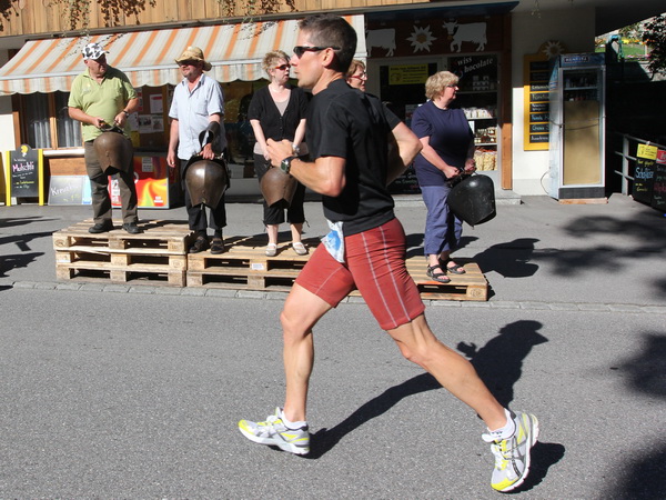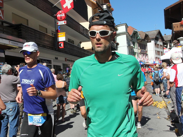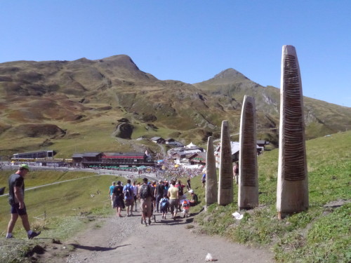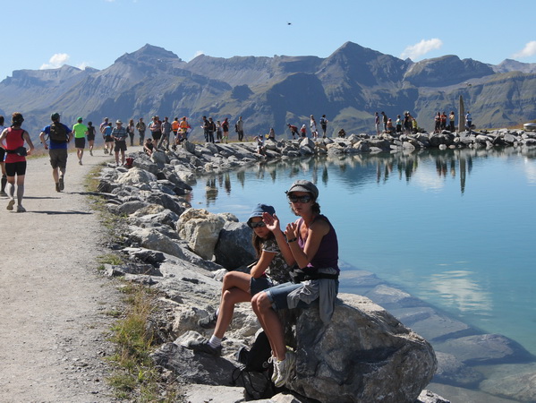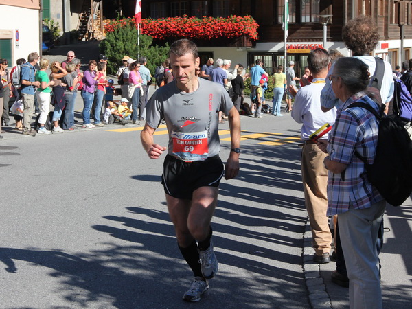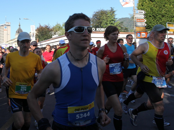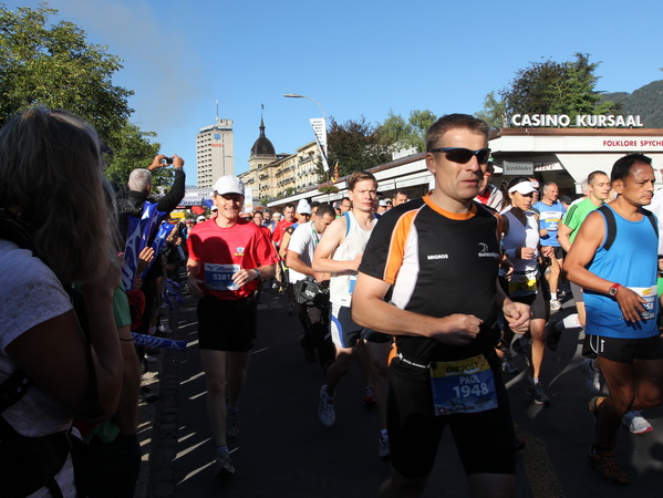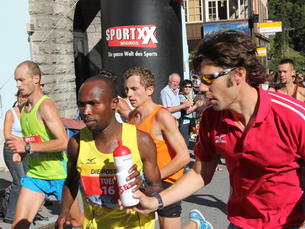 Auf halbem Weg wird noch einmal Wasser ausgeschenkt. Endlich erreichen wir den höchsten Punkt (Loucherflue 2205 m - km 40,8). Eine Gedenktafel erinnert an die Jungfrau-, NY- und Frankfurt-Marathon-Siegerin Franziska Rochat-Moser. Sie kam 2002 bei einem Lawinenunglück ums Leben. Man sollte eine weitere Gedenktafel anbringen. Für Roman Käslin nämlich. 2009 war er als Mountain-Piper zum letzten Mal im Einsatz, letztes Jahr im Mai starb er. Er war so etwas wie das Wahrzeichen des Jungfrau-Marathons. Seine Stelle nimmt jetzt Seppli Rast ein. „Willkommen, Seppli“. „Willkommen, Klaus.“