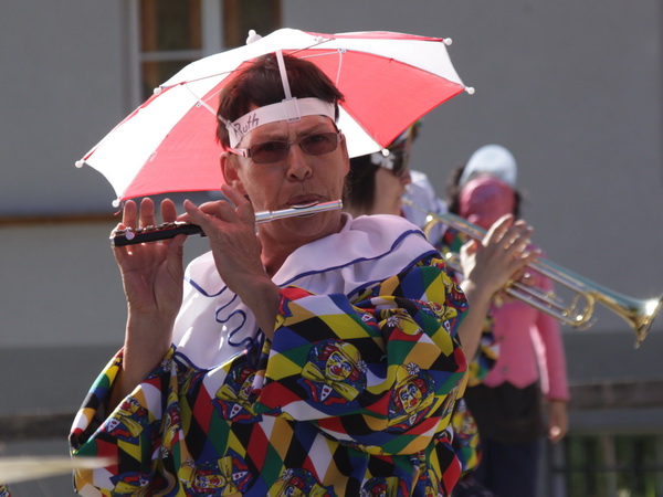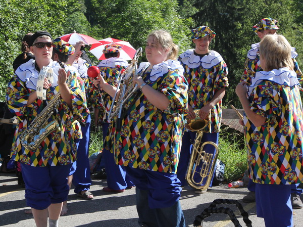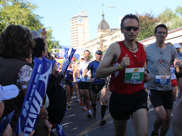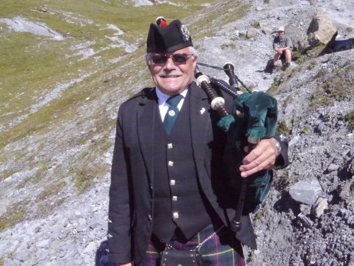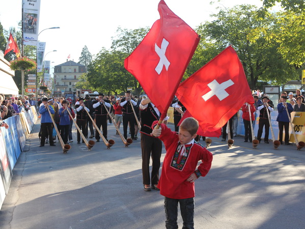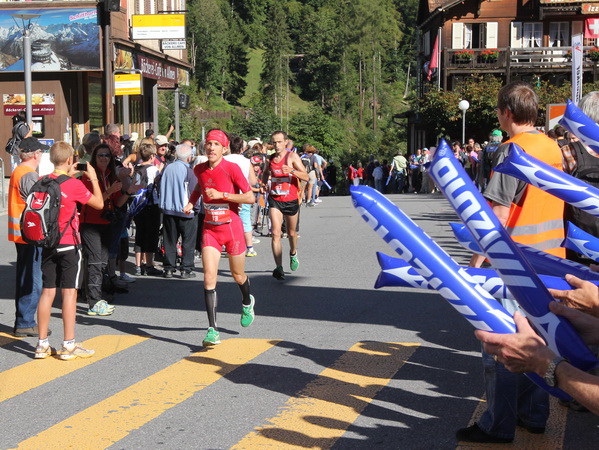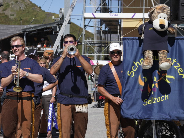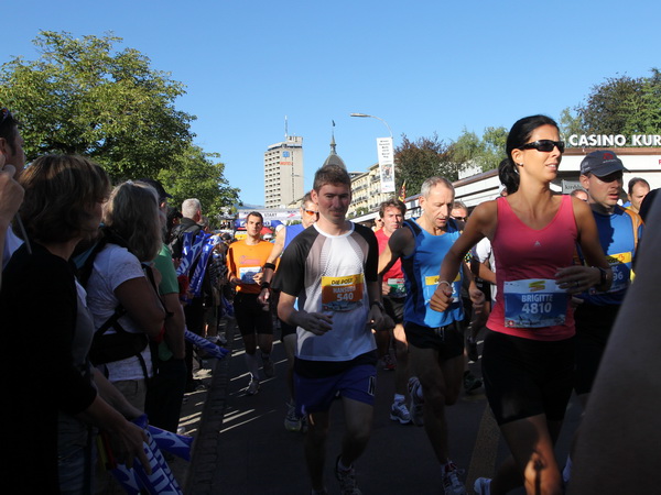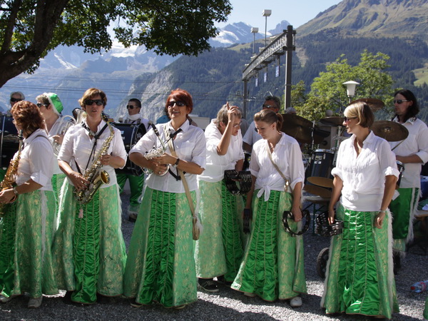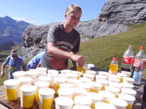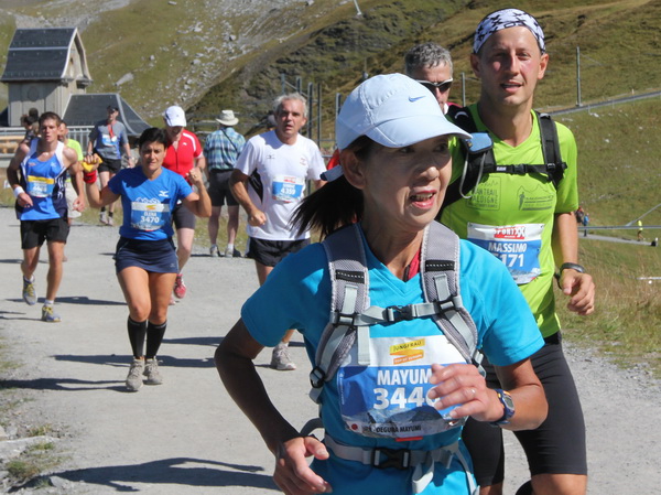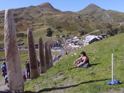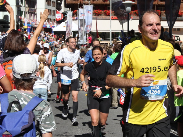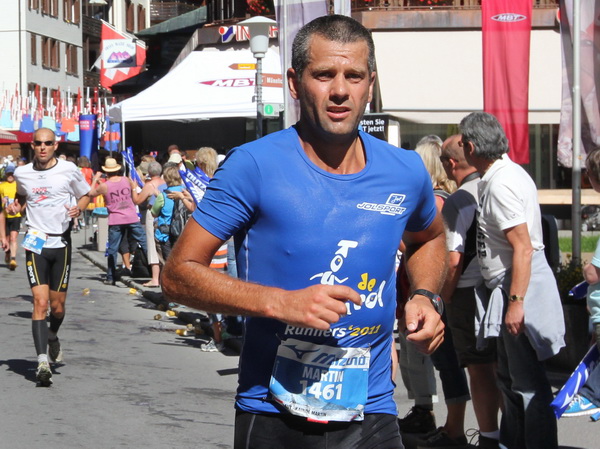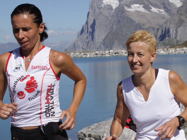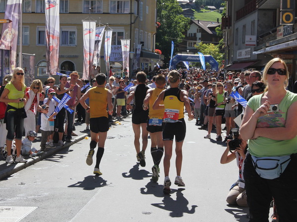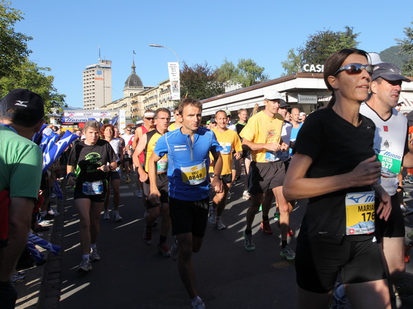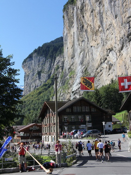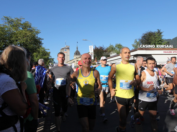 Auf halbem Weg wird noch einmal Wasser ausgeschenkt. Endlich erreichen wir den höchsten Punkt (Loucherflue 2205 m - km 40,8). Eine Gedenktafel erinnert an die Jungfrau-, NY- und Frankfurt-Marathon-Siegerin Franziska Rochat-Moser. Sie kam 2002 bei einem Lawinenunglück ums Leben. Man sollte eine weitere Gedenktafel anbringen. Für Roman Käslin nämlich. 2009 war er als Mountain-Piper zum letzten Mal im Einsatz, letztes Jahr im Mai starb er. Er war so etwas wie das Wahrzeichen des Jungfrau-Marathons. Seine Stelle nimmt jetzt Seppli Rast ein. „Willkommen, Seppli“. „Willkommen, Klaus.“