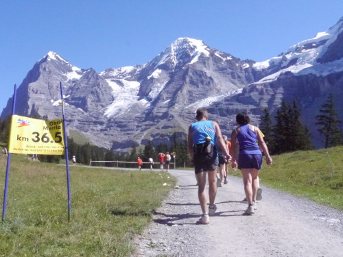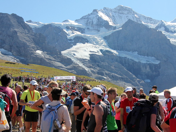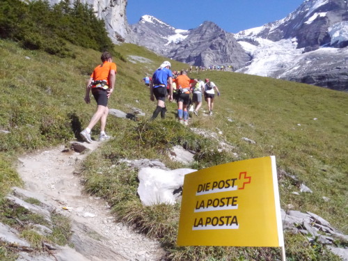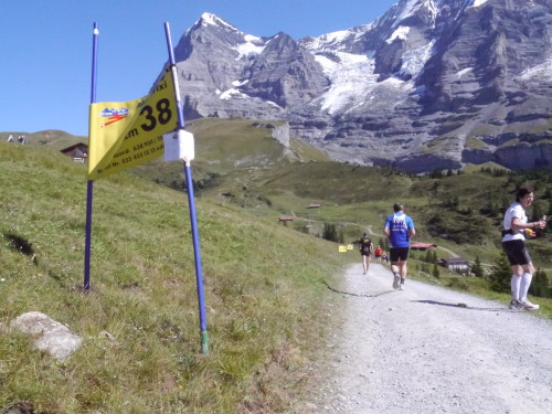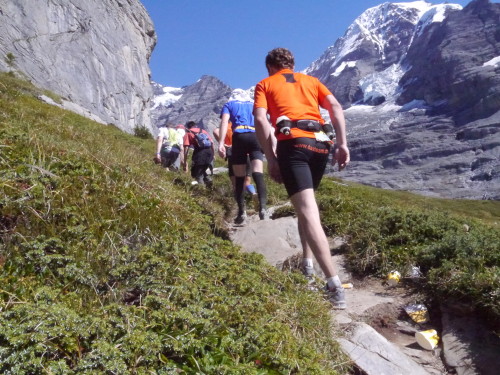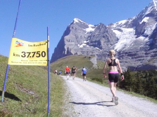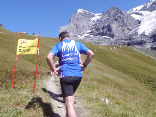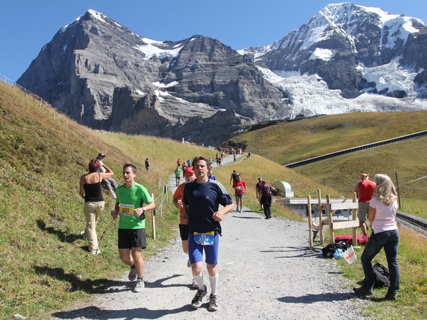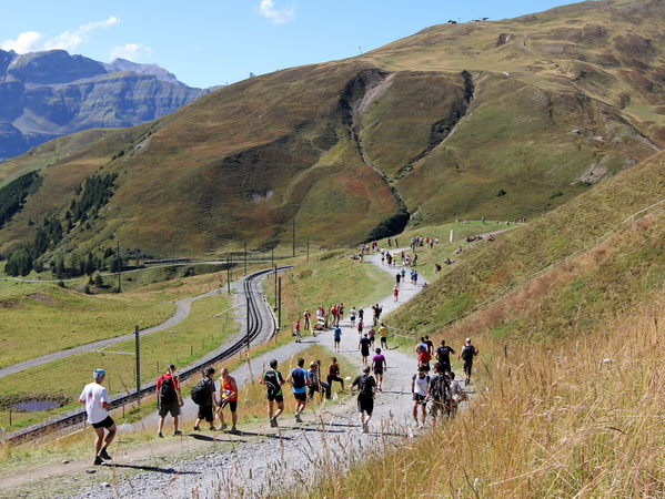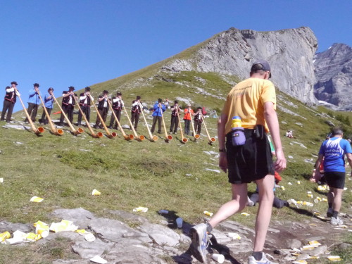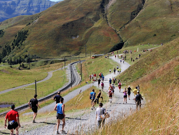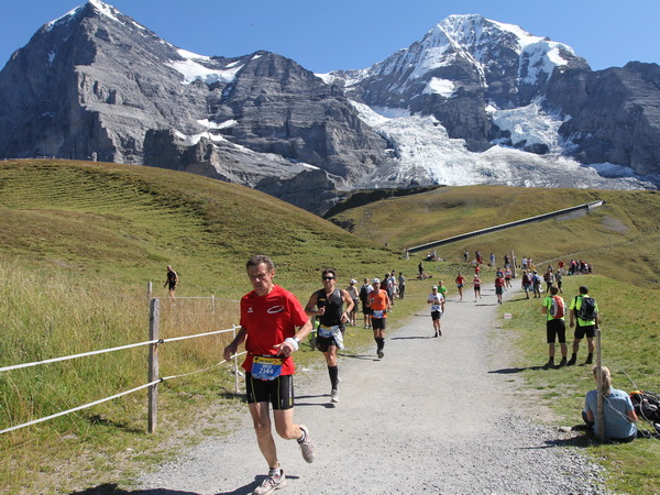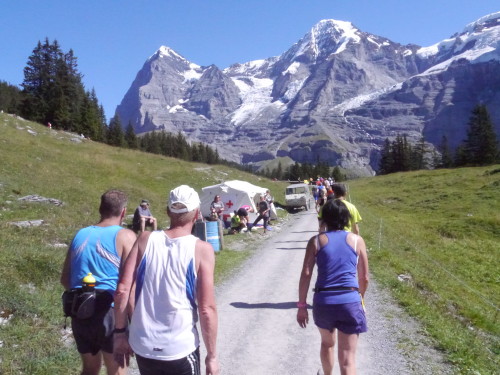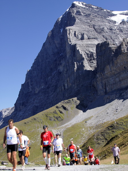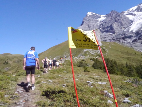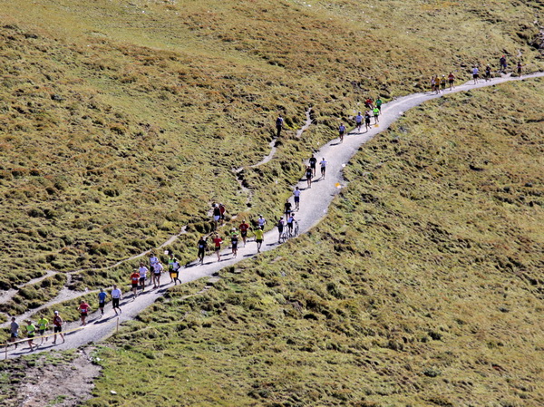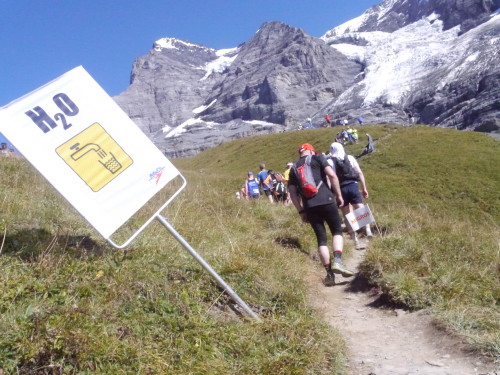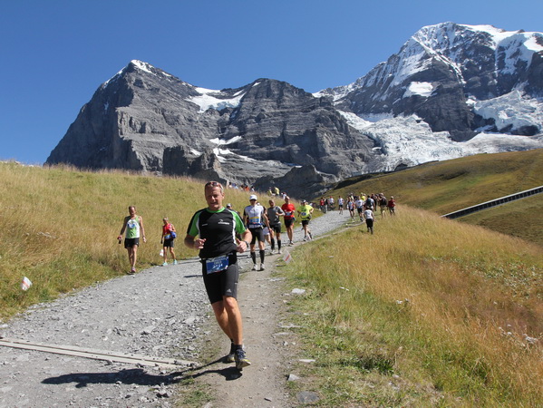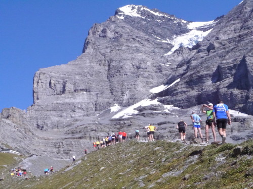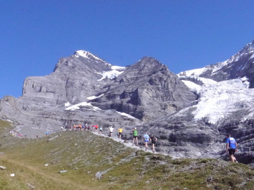 Ich habe keine Lust mehr, mich abzuhetzen. Langsam, Schritt für Schritt, bewege ich mich nach oben. Bald liegt die Baumgrenze hinter uns. Wo die zwei Strecken sich wieder treffen, ist eine weitere Getränkestelle eingerichtet. Die Fahnenschwenker und Alphornbläser erweisen sich als absolut marathontauglich und sind noch voll aktiv. Die Läuferschlange hinauf zum Eigergletscher hat deutliche Lücken und fast könnte man non-stop durchmarschieren. Man könnte ….