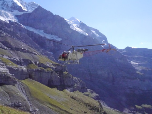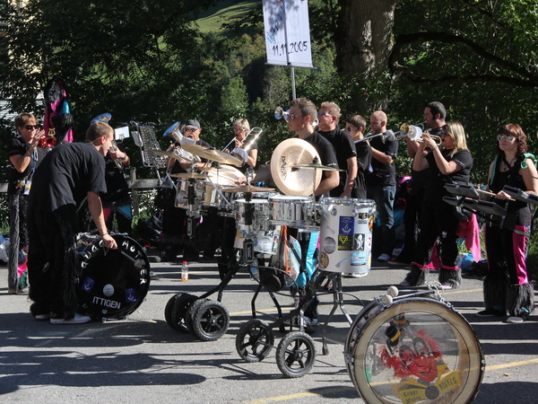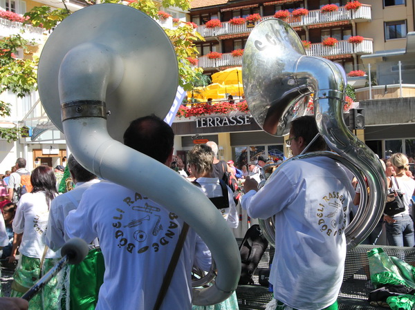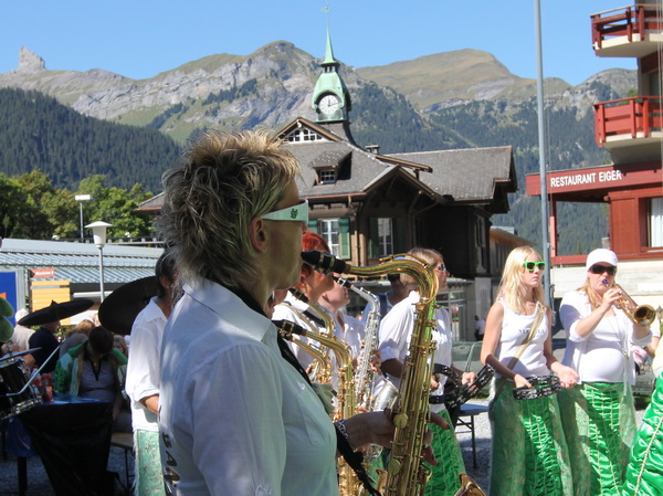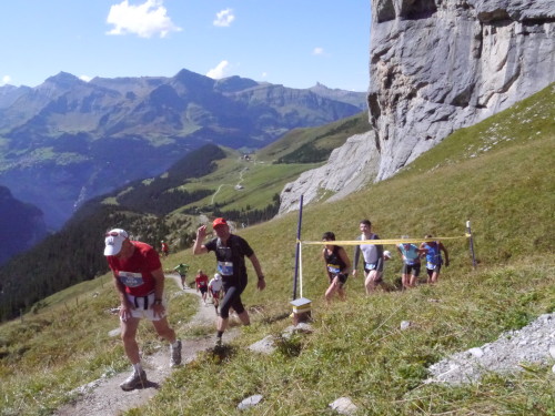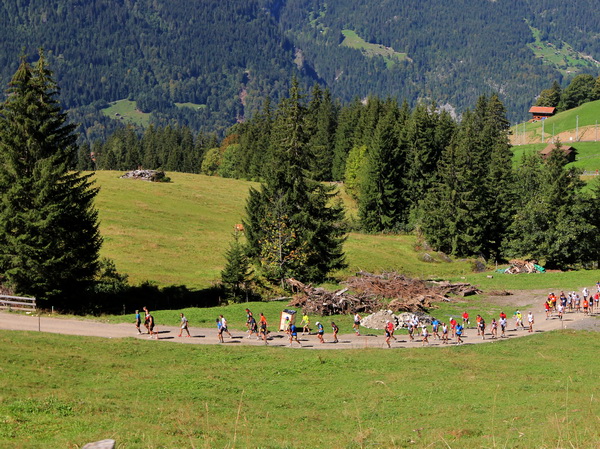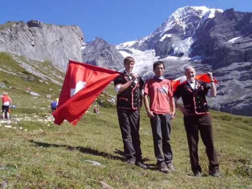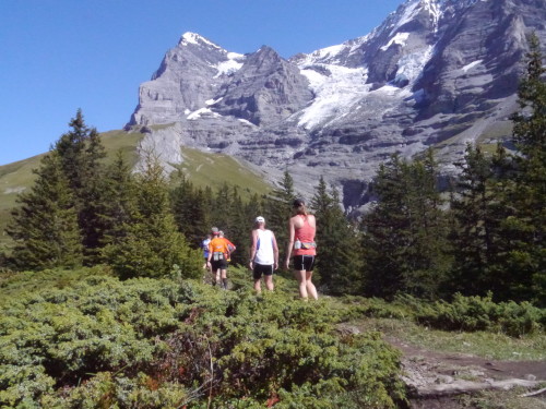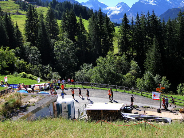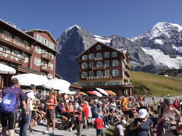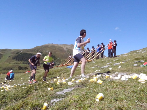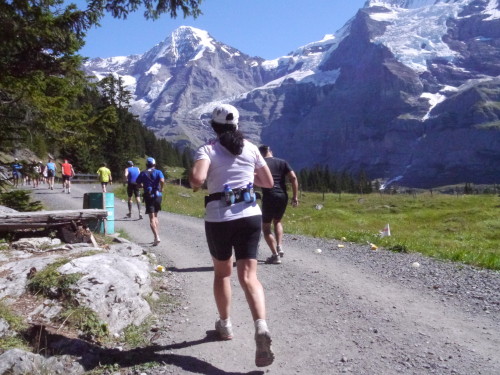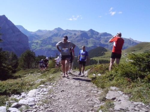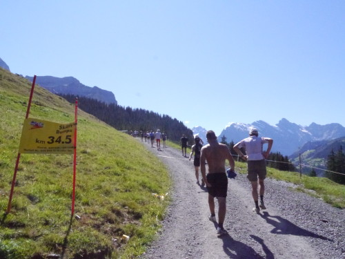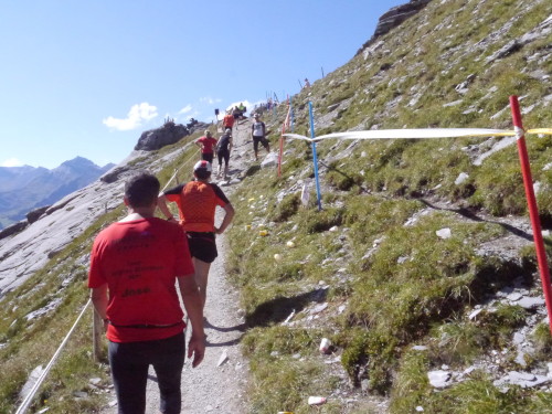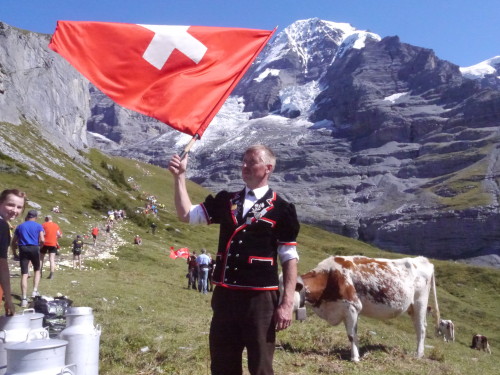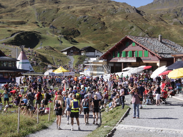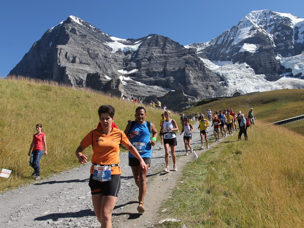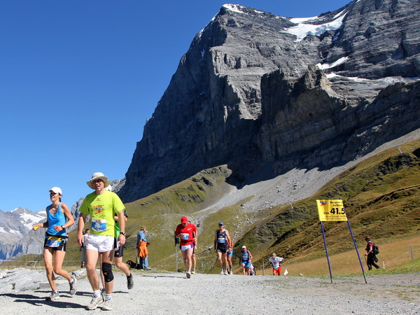Ich habe keine Lust mehr, mich abzuhetzen. Langsam, Schritt für Schritt, bewege ich mich nach oben. Bald liegt die Baumgrenze hinter uns. Wo die zwei Strecken sich wieder treffen, ist eine weitere Getränkestelle eingerichtet. Die Fahnenschwenker und Alphornbläser erweisen sich als absolut marathontauglich und sind noch voll aktiv. Die Läuferschlange hinauf zum Eigergletscher hat deutliche Lücken und fast könnte man non-stop durchmarschieren. Man könnte ….