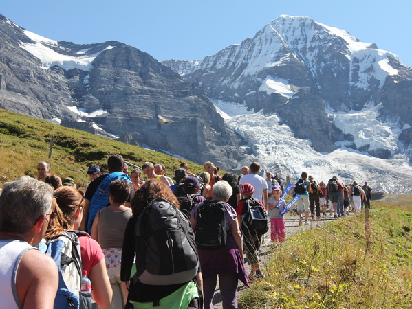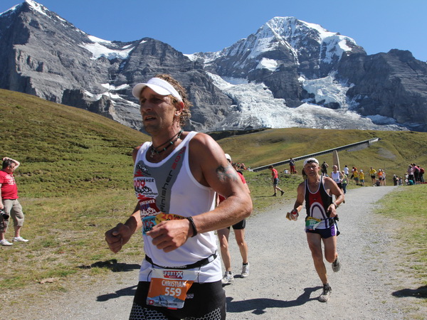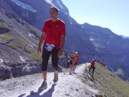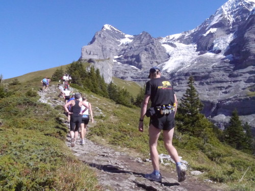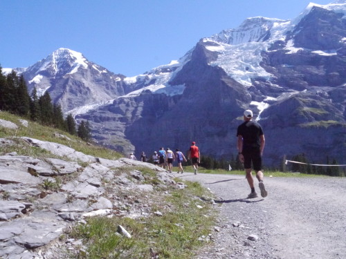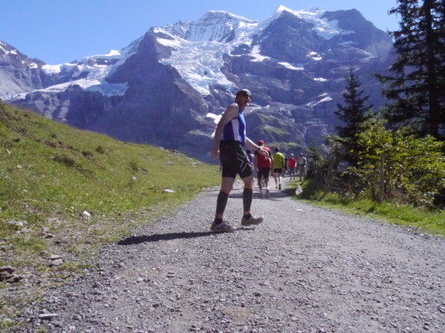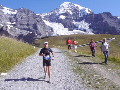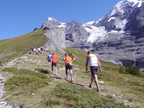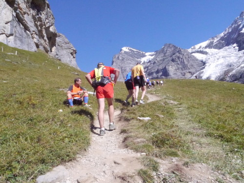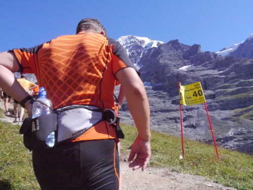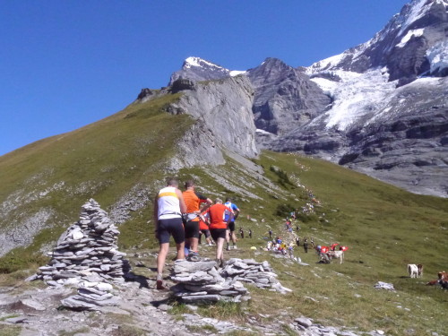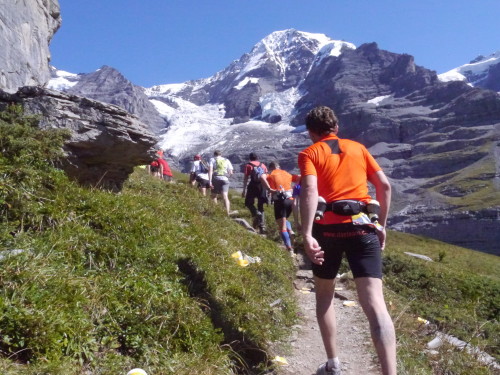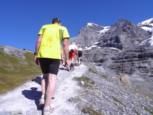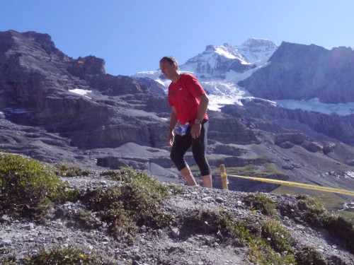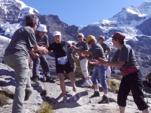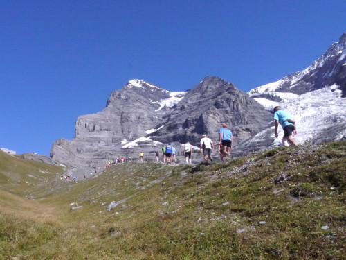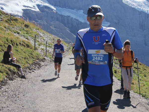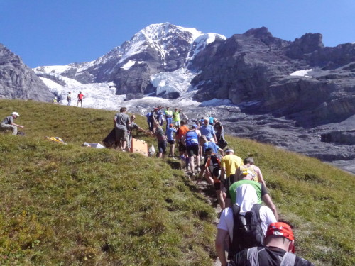 Um Staus zu verhindern, gibt es ab dem Wixi hinauf zur Moräne zwei Wege. Wir werden rechts geleitet, das ist die „Originalstrecke“. Links der Weg ist besser zu gehen, kann ich mich erinnern. Inge hat heute genau wie ich einen schweren Tag. Erstmals musste sie fürchten, aus dem Rennen genommen zu werden. Ihr müsst euch das vorstellen: Sie war bei allen Jungfrau-Marathons dabei! Heute also zum 19. Mal! Und den 20. will sie sausen lassen. „Ich schaffe das nicht mehr in der Zeit“, klagt sie.