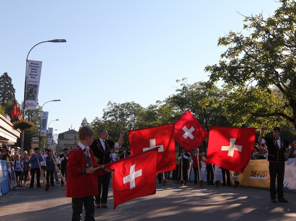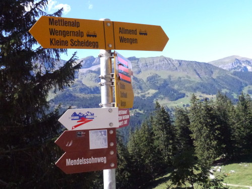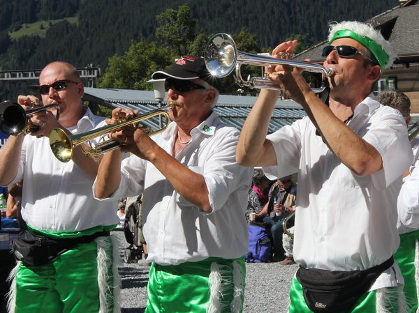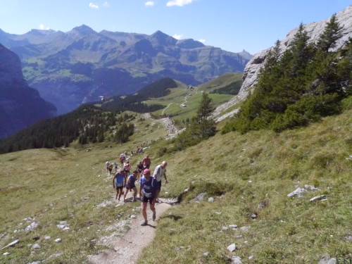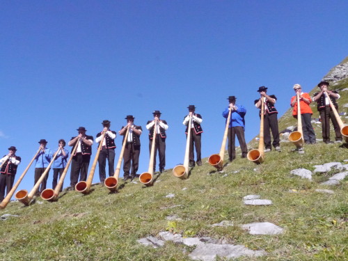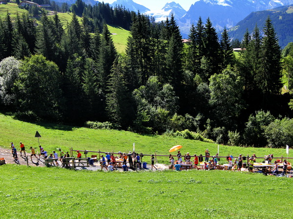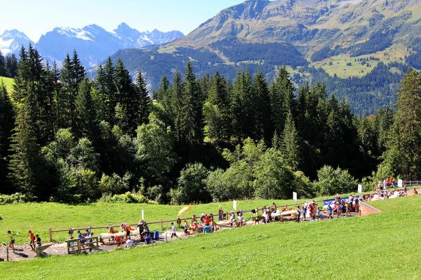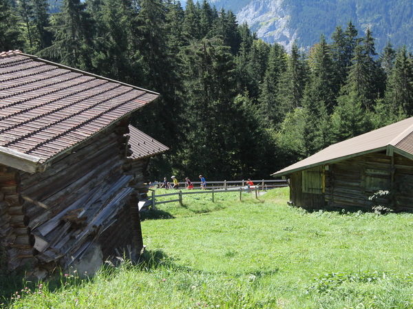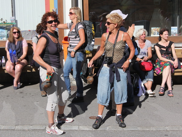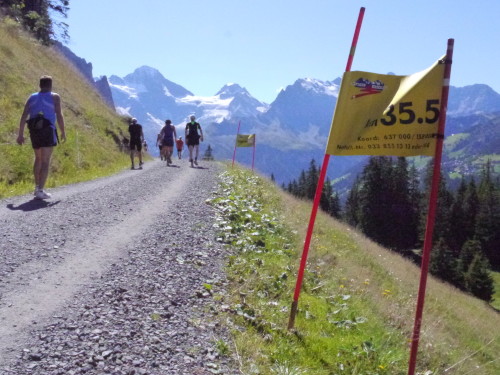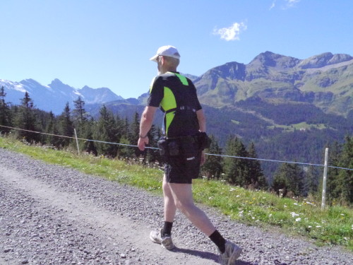 Das Dreigestirn ist jetzt komplett, die Landschaft, saftige Almwiesen, dunkle Wälder, weiße Berge vor strahlend blauem Himmel, paradiesisch. Trotz des Zeitdrucks mache ich viele Fotos. Ich weiß ja nicht, dass ich meisten wegen einer Fehleinstellung wegschmeißen muss. Und dauernd schaue ich zur Uhr. Reicht die Zeit bis zum Wixi? Eine junge Schweizerin macht mir Angst. Mit Riesenschritten zieht sie an mir vorbei. „Verdammt eng heute“, sagt sie vor sich hin und nimmt kaum einmal den Blick von ihrer Uhr. Zeit zum Trinken nimmt sie sich nicht. Jede Gelegenheit nutzt sie aus, um ein paar Meter zu laufen. Stress pur.