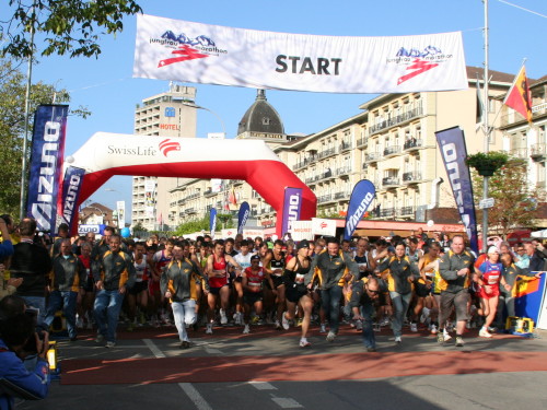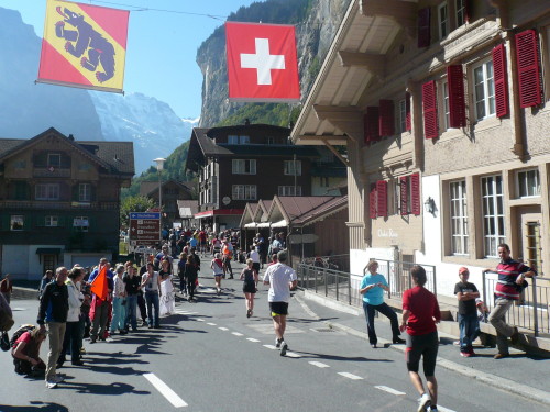 Der Jungfrau Marathon beginnt mit einem Triumphlauf durch die Stadt. Anders kann man die Schleife durch das mit Fahnen geschmückte Interlaken, vorbei am Bahnhof, durch die Innenstadt und zurück auf das Startgelände, nicht bezeichnen. Blasmusik, das Geläut hunderter Kuhglocken und der Jubel der Menschen sorgen für eine grandiose Geräuschkulisse.