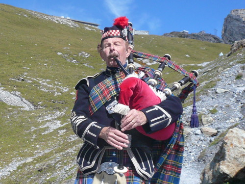 Endlich ist Roman Kaeslin’s Dudelsack vom höchsten Punkt der Strecke (Eigergletscher, 2205 m) zu hören. Der leidenschaftliche Piper im traditionellen Highland-Dress gehört zum Jungfrau Marathon wie der Eiger zum Dreigestirn. Würde er nur sein Instrument spielen und nicht hin und wieder in Schwyzer Dytsch was sagen, er ginge jederzeit als Original Highlander durch. Der Anstieg ist zu Ende, wir verlassen den Pfad nach links und bekommen noch einmal Getränke gereicht. Über die folgende Kuppe helfen kräftige Hände, dann sieht man unten schon die Kleine Scheidegg und das Ziel.