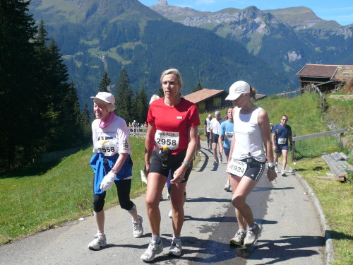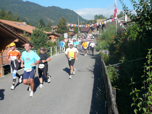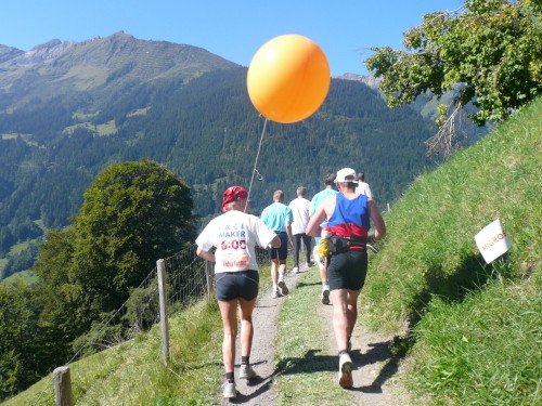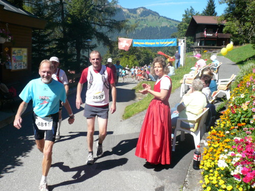 Stop and go bis wir den Wald verlassen. Genau eine halbe Stunde ist vergangen, bis nach gut einem Kilometer die Alphornbläser und Fahnenschwenker erreicht werden. Ganz ohne aufgezwungene Stopps geht es auch auf den folgenden Stück nicht weiter. Das hat auch sein Gutes. Die sonst üblichen leichenblassen und sich übergebenden Läufer sieht man nicht. Für das „Tempo“ hier braucht sich keiner verausgaben. Nur Andrea macht noch einmal Dampf, erscheint später mit 6:01 in der Finisherliste - fast Punktlandung, trotz Handicap. Respekt.