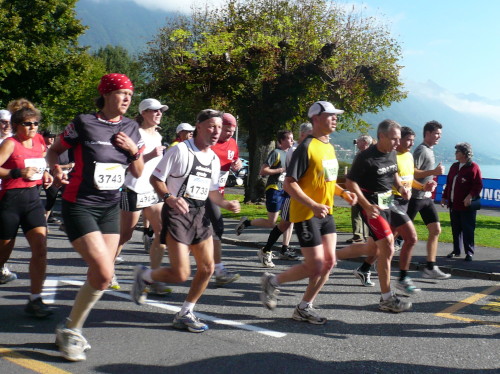 Sofort ist man mitten drin in der Menge. Ein „Hallo“ hier, ein „Wie geht es“ dort, man kennt sich aus Liechtenstein, Zermatt oder Davos. Auch einige Finisher vom Ultra Trail um den Mont Blanc (Glückwunsch, Mathias) sind schon wieder aktiv. Es gibt viel zu erzählen. Jeder Vierte der ungefähr 4285 Marathonis (Finisher) kommt aus Deutschland, 2372 aus der Schweiz. Nur 93 bzw. 80 aus den Nachbarländern Österreich und Italien, aber immerhin 218 aus den flachen Niederlanden. Insgesamt nehmen Läuferinnen und Läufer aus 48 Nationen teil.
