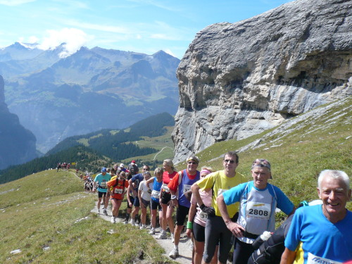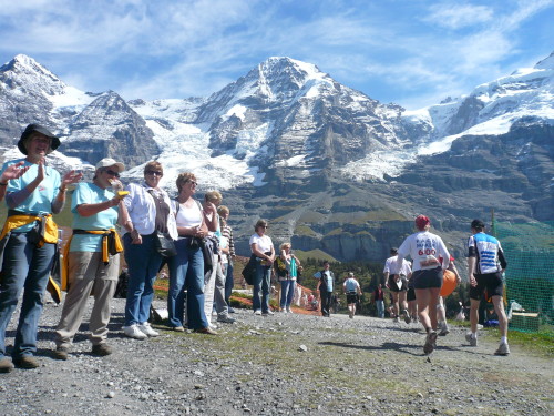 Das Gepäck ist man schnell los, es wird wie immer wahllos auf LKW’s verladen, sortiert wird auf der Kleinen Scheidegg. Das Wetter ist genial, strahlender Sonnenschein bei angenehmen Temperaturen um die 15 Grad. Die Zeit vergeht im Flug. Schon werden die Eliteläufer vorgestellt, dann ertönt der Startschuss, dem weitere Böllerschüsse folgen. „Das Echo“, meint der Sprecher.