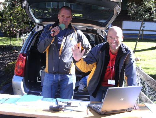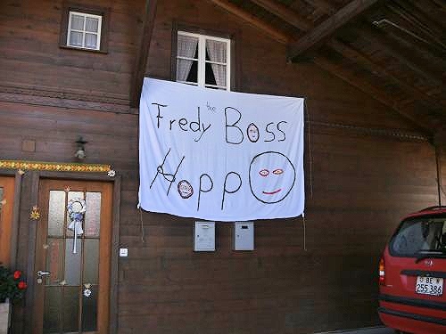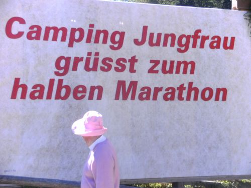 Am Ortsausgang von Lauterbrunnen liegt der Campingplatz Jungfrau. Hier steigt freitags eine Pasta-Party und wird nach dem Lauf gefeiert. Am Morgen des Laufes wird den Läufern von hier ein kostenloser Bustransfer zum Start in Interlaken geboten. Hab ich vor Jahren auch schon einmal mitgemacht. Ein Schild grüßt die Läufer und eine Zeitmessmatte registriert die Halbmarathonzeit.