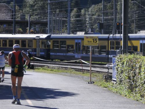 In Zweilütschinen queren wir die Bahn und Straße nach Grindelwald – Läufer haben heute Vorfahrt. Die Absperrung ist wieder einmal perfekt. KM 15 ist erreicht. Am Bahnhof warten Touristen auf die Züge und schauen derweil den Läufern zu.