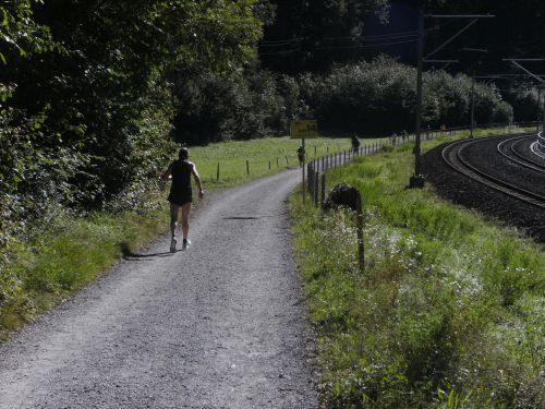 Die Strecke führt abwechslungsreich in der Summe leicht ansteigend nach Lauterbrunnen. Wir laufen einige KM im Schatten. Hier ist es noch ziemlich frisch. Aber weiter oben wartet wieder die Wärme der Sonne auf uns Läufer.