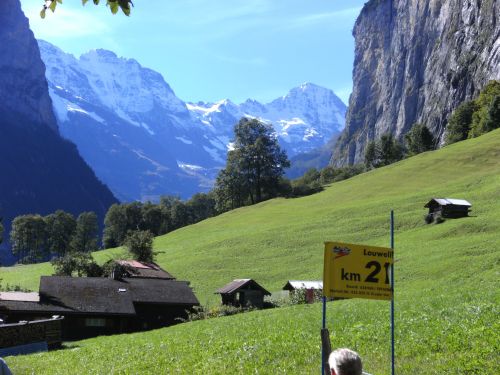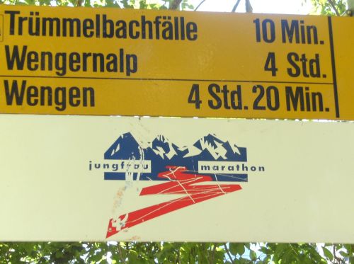 Die erste Hälfte ist geschafft. 2.30 Std., ich bin zufrieden. Um das Zeitlimit in Wengen oder Wixi brauche ich mir wohl keine Gedanken zu machen. Auf geht’s zur zweiten Hälfte. Die beginnt mit einer lockeren Runde durchs Lauterbrunner Tal. Ein Wegweiser gibt als Zeit herauf nach Wengen 4 Std. 20 Min. an. Das können wir doch wohl toppen?