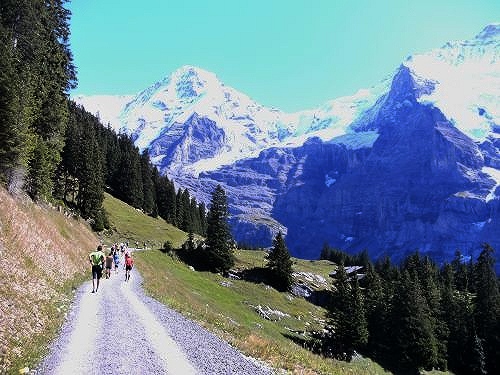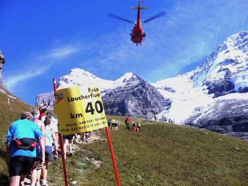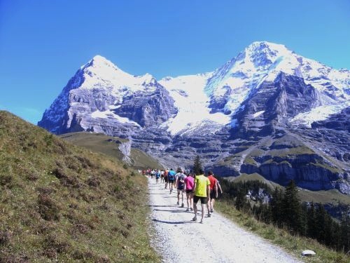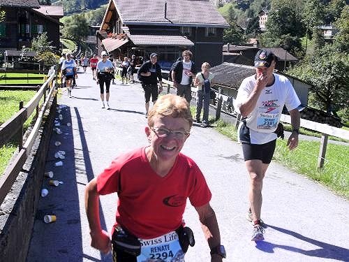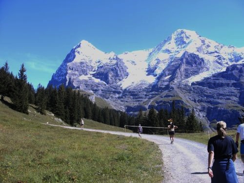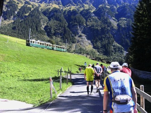 Es wird zumeist gegangen. Nur noch kurze Abschnitte sind zu laufen. Der Übergang vom Gehen zum Laufen fällt auch mir zunehmend schwerer. Umgekehrt ist es leichter. Aber das Ziel kommt näher. Dazu entschädigt uns der einmalige Blick auf das weltberühmte Dreigestirn Jungfrau, Mönch und Eiger für alle Strapazen. Das Panorama ist unverändert atemberaubend. Es ist ein Genuss heute hier laufen zu dürfen.