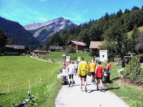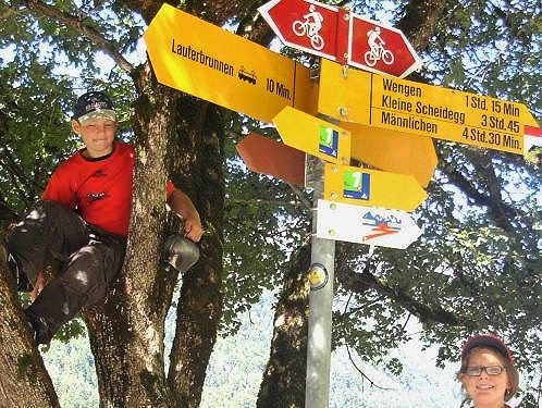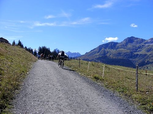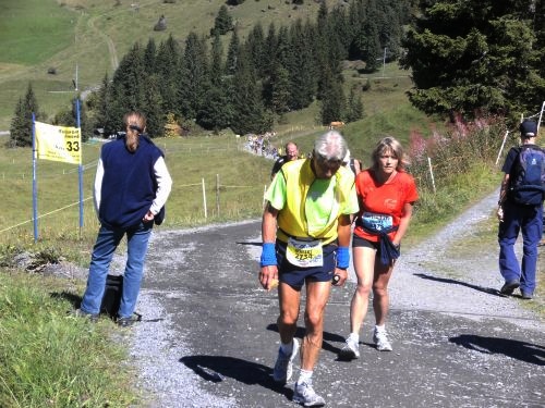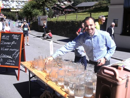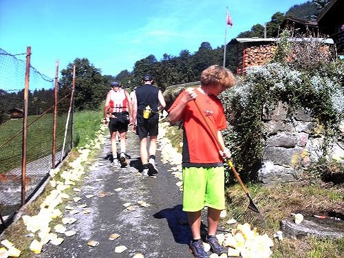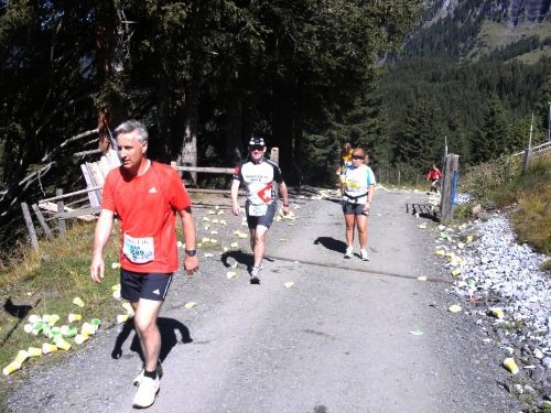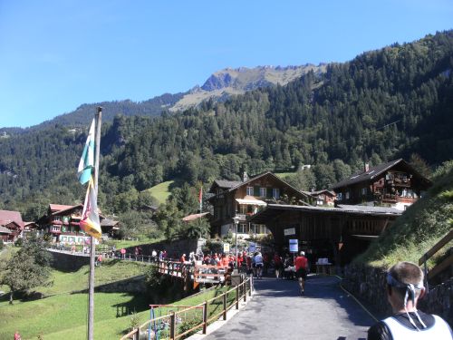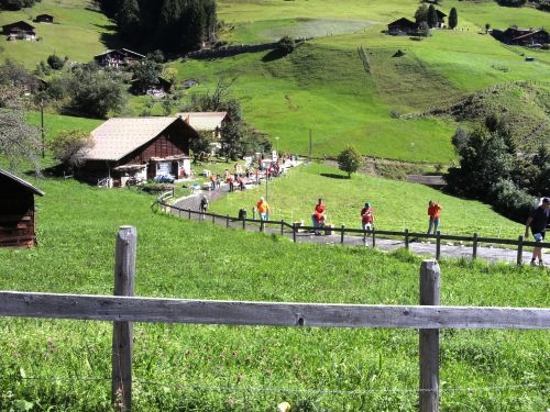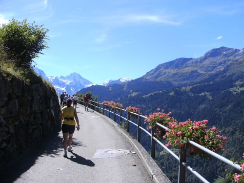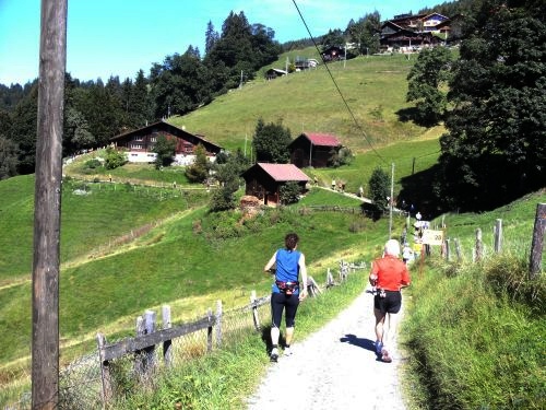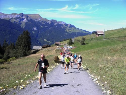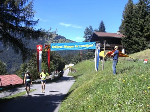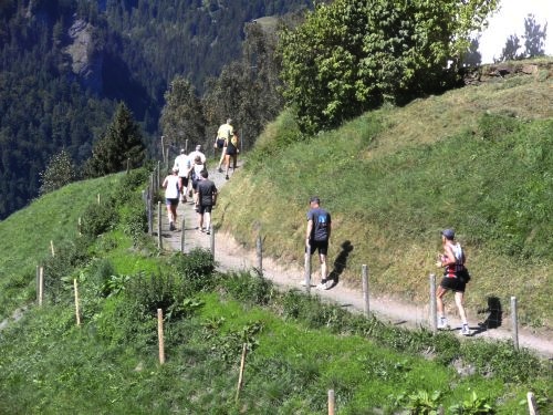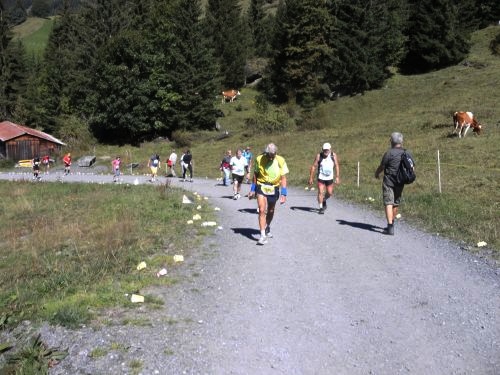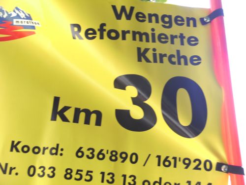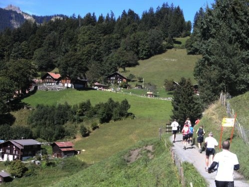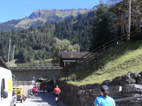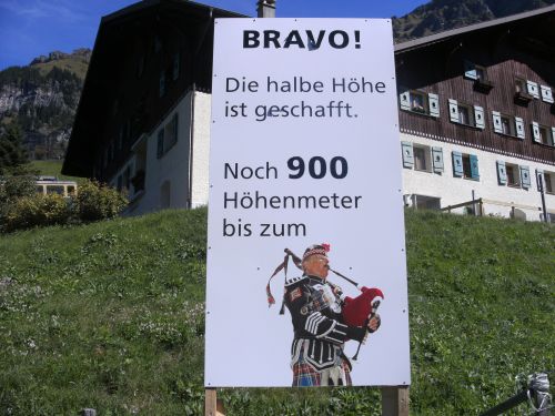 Am Ausgang von Wengen weist ein Schild darauf hin, dass die Hälfte der Höhenmeter bewältigt sind. Das Läuferfeld ist schon lange weit auseinander gezogen. Jeder kämpft sich den Berg hinauf. Die Sonne strahlt kräftig und wärmt die Läufer ordentlich. Mir fällt ein Mann auf, der auf originelle Art die Läufer anfeuert. Er sitzt mit einem Gipsbein vor seinem Haus und lässt eine Trychel mit einer Schnur erklingen.