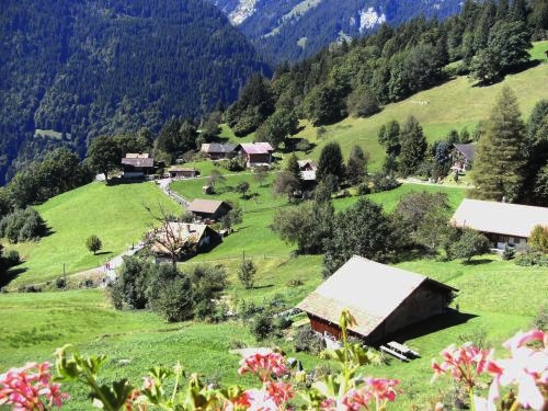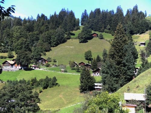 Vor Wengen grüßt wieder ein Fahnenschwenker die Läufer. Auf der Straßenseite ihm gegenüber sehe ich eine Modelleisenbahn im Freien. Auch hier in Wengen sitzen und stehen die Menschen vor ihren Häusern.