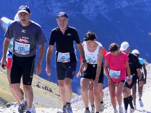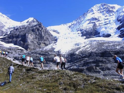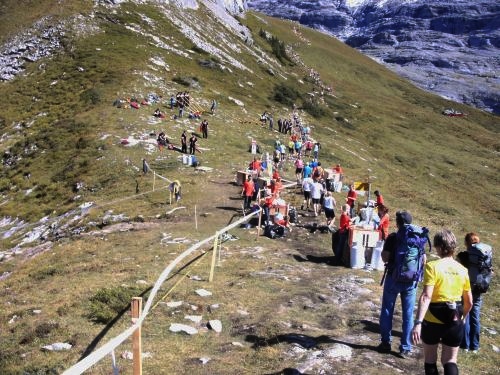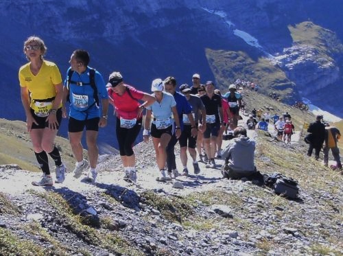 Wie an einer Perlenschnur aufgereiht zieht sich die Läuferkette das Steilstück hinauf zur Moräne. Schritt für Schritt geht’s steil nach oben. Es geht zwar langsam, aber es geht. Wohl dem, der hier noch Körner hat. Ich muss im Steilstück zwar mein Tempo drosseln, ein Überholen ist nicht möglich, aber dafür habe ich umso mehr Zeit und Muße den Blick auf Jungfrau, Mönch und Eiger zu genießen.