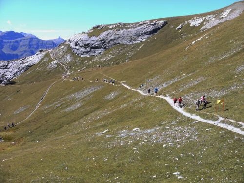 Vor Wixi sehen wir links von uns wieder einmal die Jungfraubahn. Wir haben jedoch vor dem schweren und langen Schlussanstieg erst einmal einige Meter bergab zu laufen. Bei Wixi ist eine Verzweigung eingerichtet. Es gibt eine linke und rechte Variante. Dadurch möchte man einem Stau auf der Strecke vorbeugen bzw. entzerren.