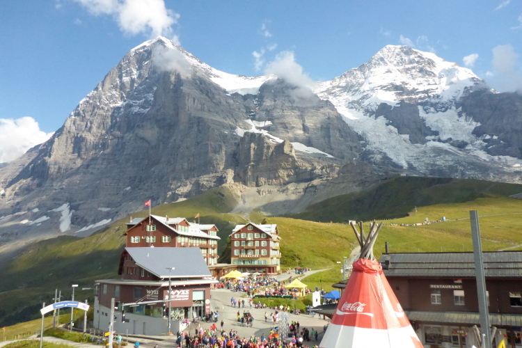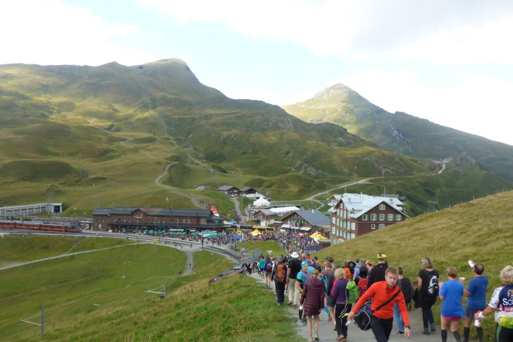 Ich setze mich an Den Hang und schaue mir 90 Minuten lang den Trubel von oben an. Viele Läufer, viele Angehörige und noch mehr Touristen. Hier ist einfach was los. 1840 wurde auf der Kleinen Scheidegg das erste Hotel eröffnet, das Bellevue. 1896 entstand daneben das Hotel des Alps. 1929 wurden beide Hotels durch einen Saalanbau zum Bellevue des Alps verbunden. 2011 wurde es als "Historisches Hotel des Jahres" ausgezeichnet. Bereits 1893 wurde die Bahnstrecke von Lauterbrunnen über die Kleine Scheidegg nach Grindelwald eröffnet. 1912 war dann nach 16 Jahren Bauarbeiten auch die neun Kilometer lange Strecke von hier bis hinauf zum Jungfraujoch fertig, die in vielen Tunnels durch den Eiger führt, unterwegs aber an zwei spektakulären Aussichtspunkten anhält.